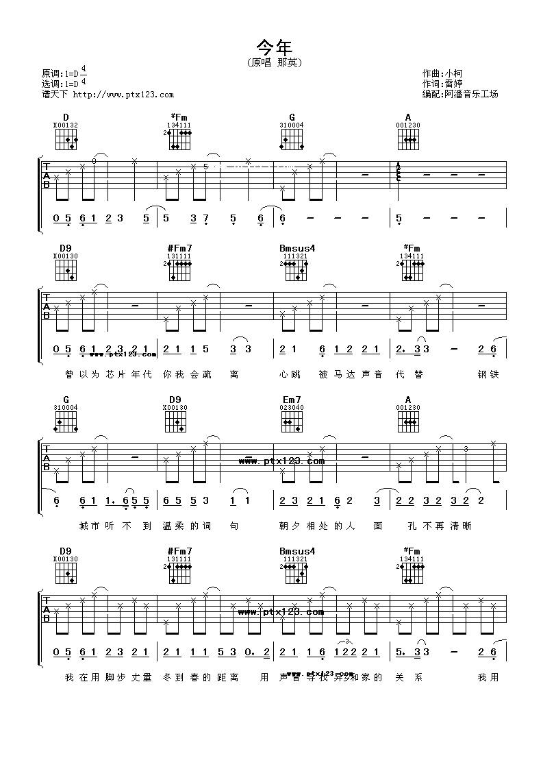 今年吉他谱_D调女生版_阿潘音乐工场编配_那英_吉他谱_钢琴谱_简谱