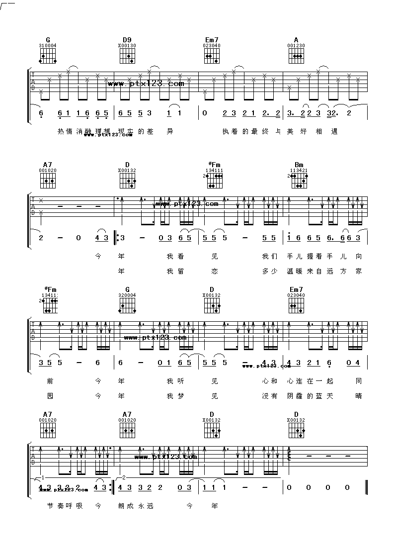 今年吉他谱采用了D调指法,由阿潘音乐工场编配完成。那英的歌声是无可替代的,有着她自己独特的魅力,我们在《中国好声音》这档综艺节目上看到了那英的音乐爆发力,在这首歌曲之中,那英唱出了自己独特的味道,或许只有经历过的人才懂得今年这首歌曲的意味,不知道今年的我们会是什么样的模样,是依然相爱的,还是早已走向了各自不同的方向,未来总是未知的,一段美好的感情需要我们去经营。另外一首,给你宇宙吉他谱也很赞,小伙伴可以愉快的学习起来了。