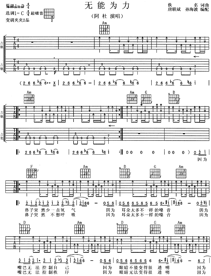 无能为力吉他谱_C调六线谱_阿杜_吉他谱_钢琴谱_简谱