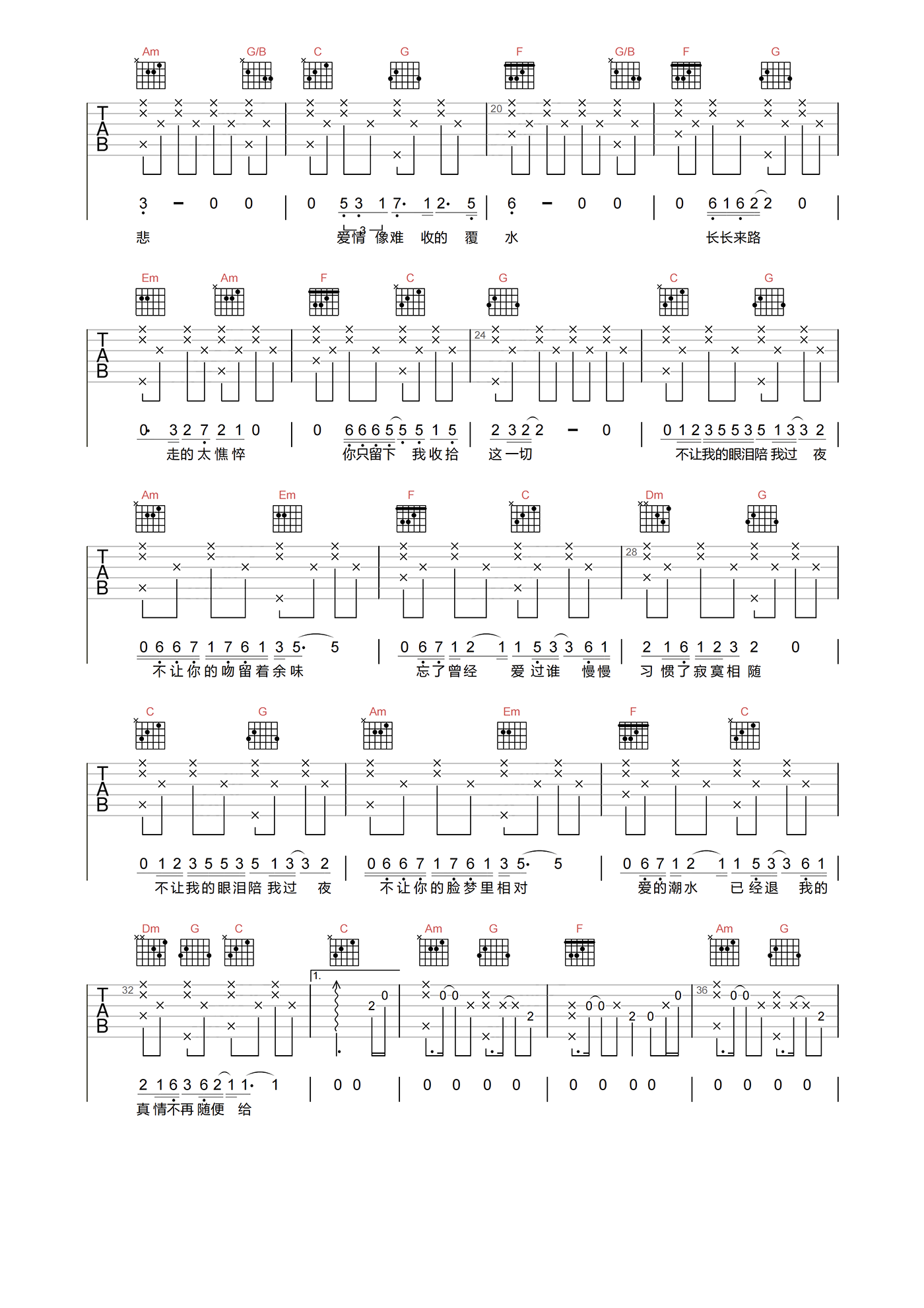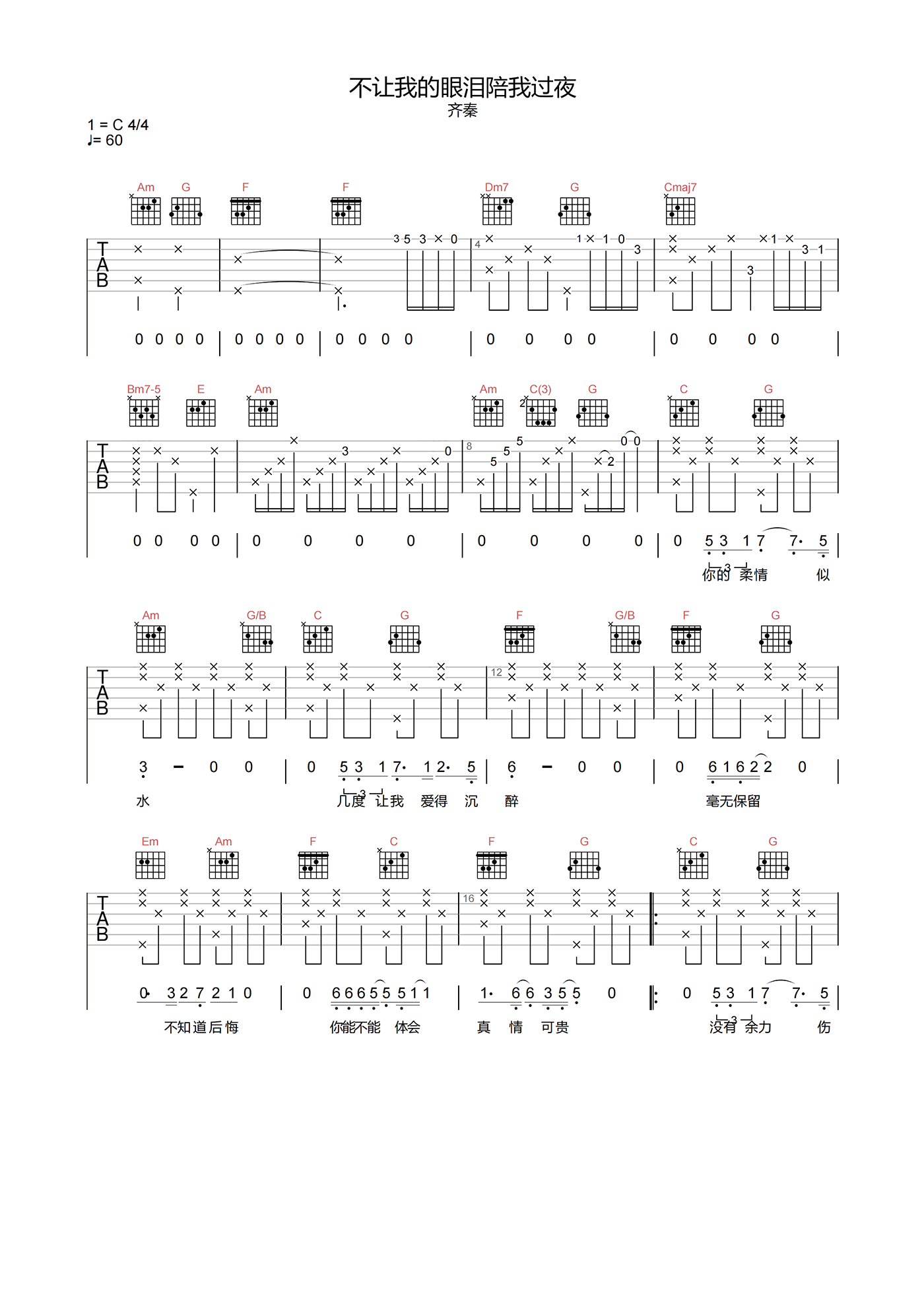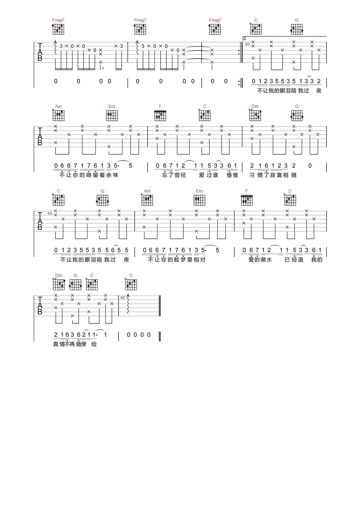 不让我的眼泪陪我过夜吉他谱_C调原版_弹唱六线谱_吉他谱_钢琴谱_简谱