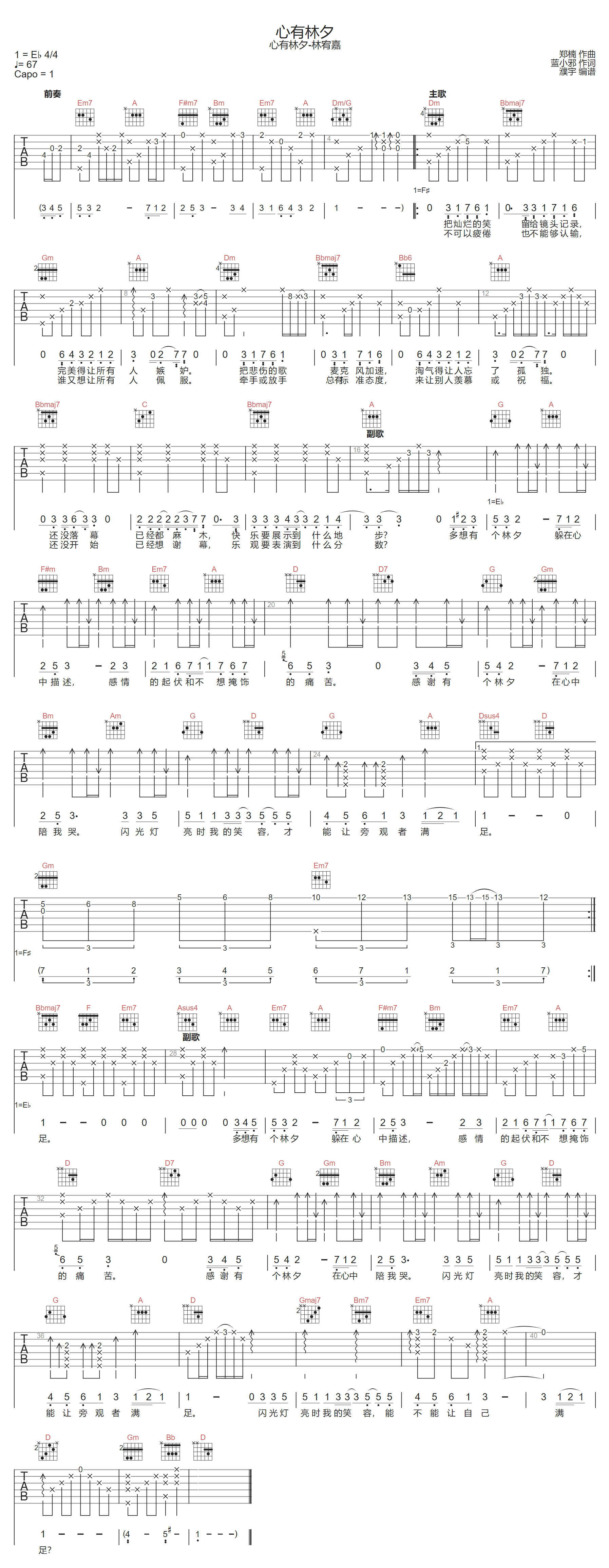 心有林夕吉他谱,歌曲原调为降E调,此版本的曲谱来源于@濮宇,为4/4拍的节奏,按D调指法编配,共1张高清吉他谱,变调夹1品为原歌曲的调式,演唱时可按个人音域选择合适的变调夹位置。