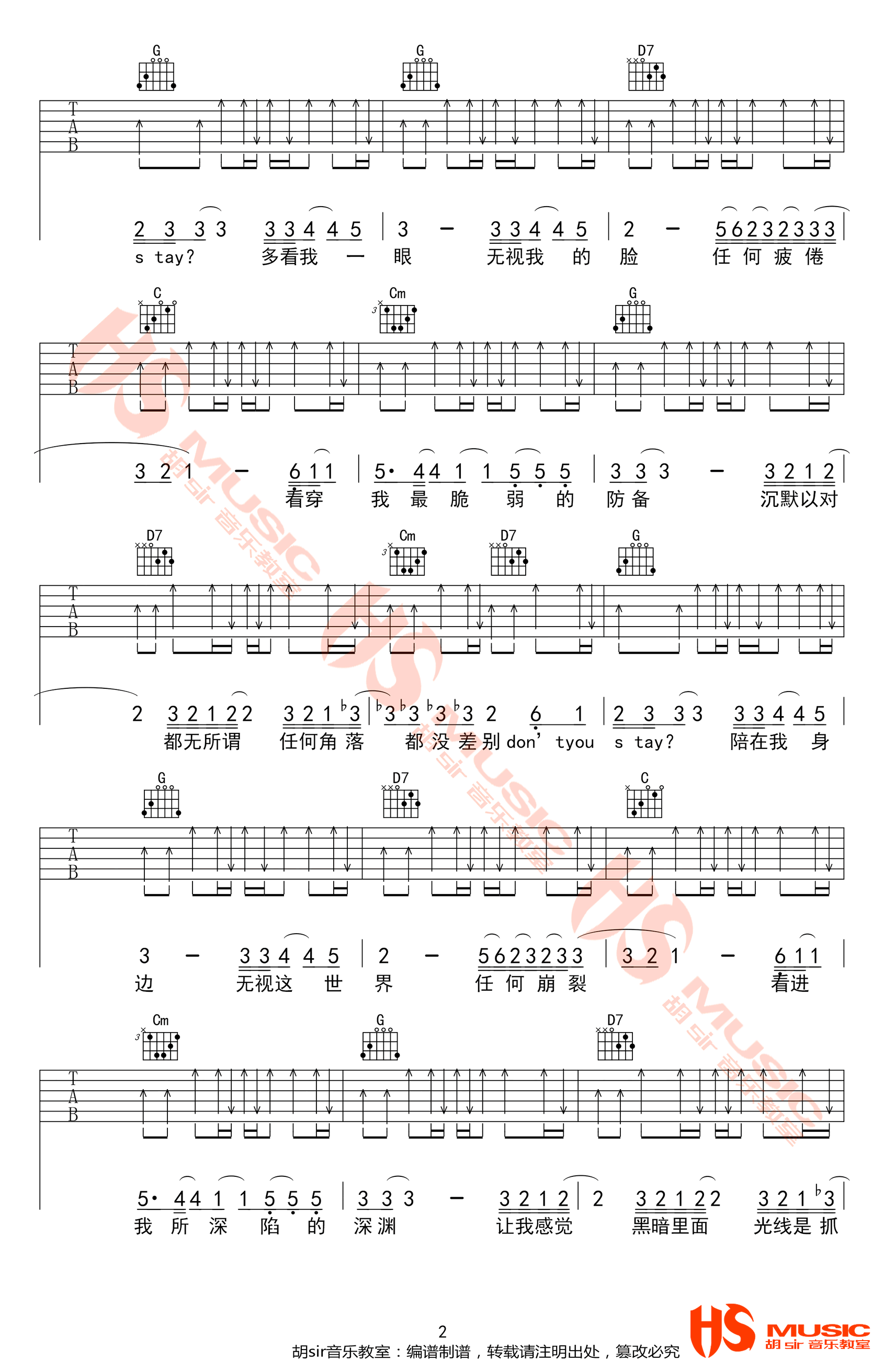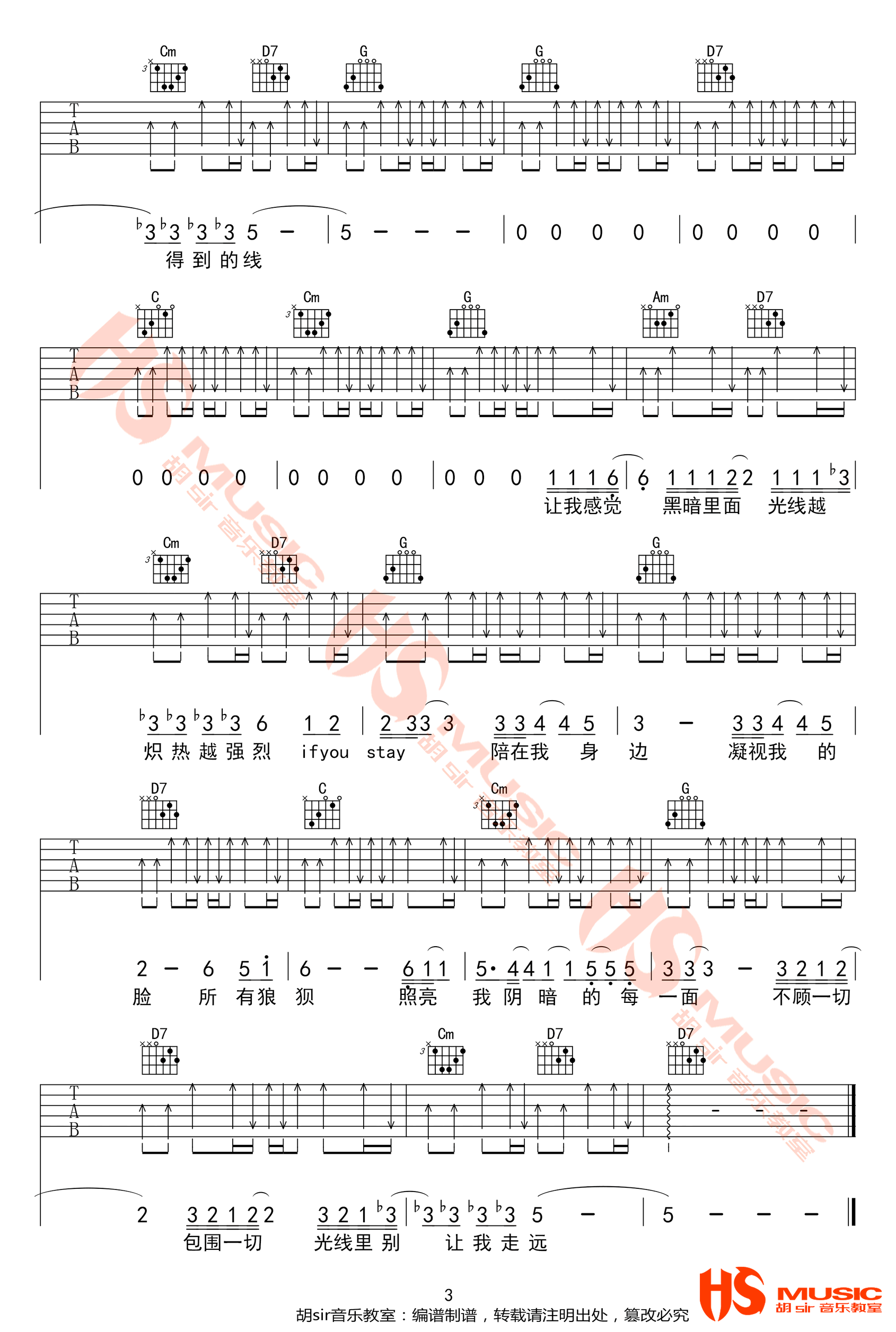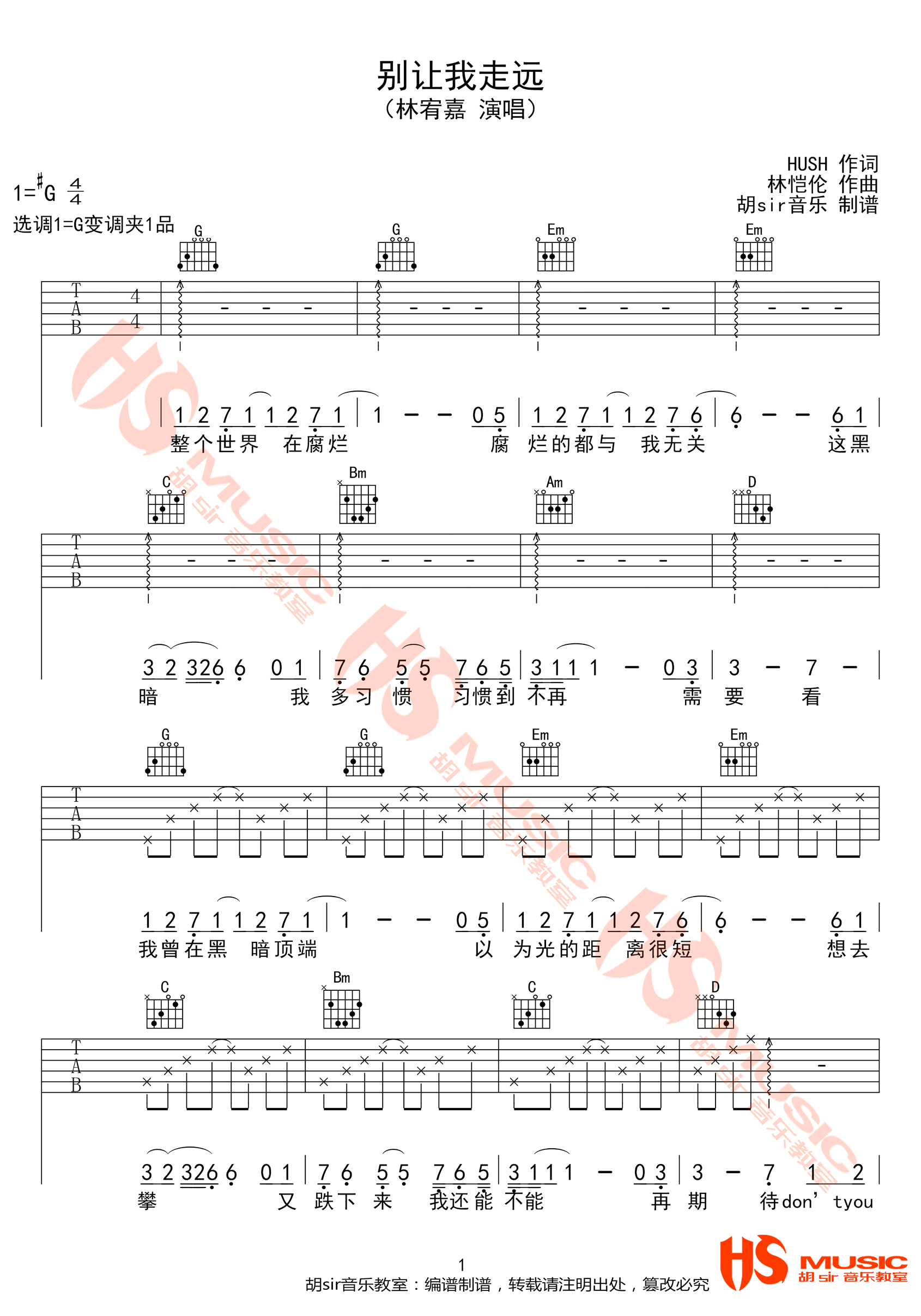 别让我走远吉他谱,歌曲原调为降A调,此版本的曲谱来源于@胡sir吉他,为4/4拍的节奏,按G调指法编配,共3张高清吉他谱,变调夹1品为原歌曲的调式,演唱时可按个人音域选择合适的变调夹位置。
