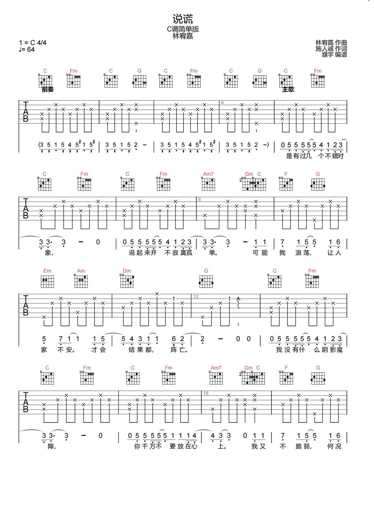 《说谎》吉他谱,由林宥嘉演唱的一首歌曲,共有4张高清图片谱,《说谎》吉他弹唱谱,节奏拍号4/4,速度64拍每分钟,选用C调指法,原调C,无需使用变调夹,或可根据自己嗓音调整变调夹位置。