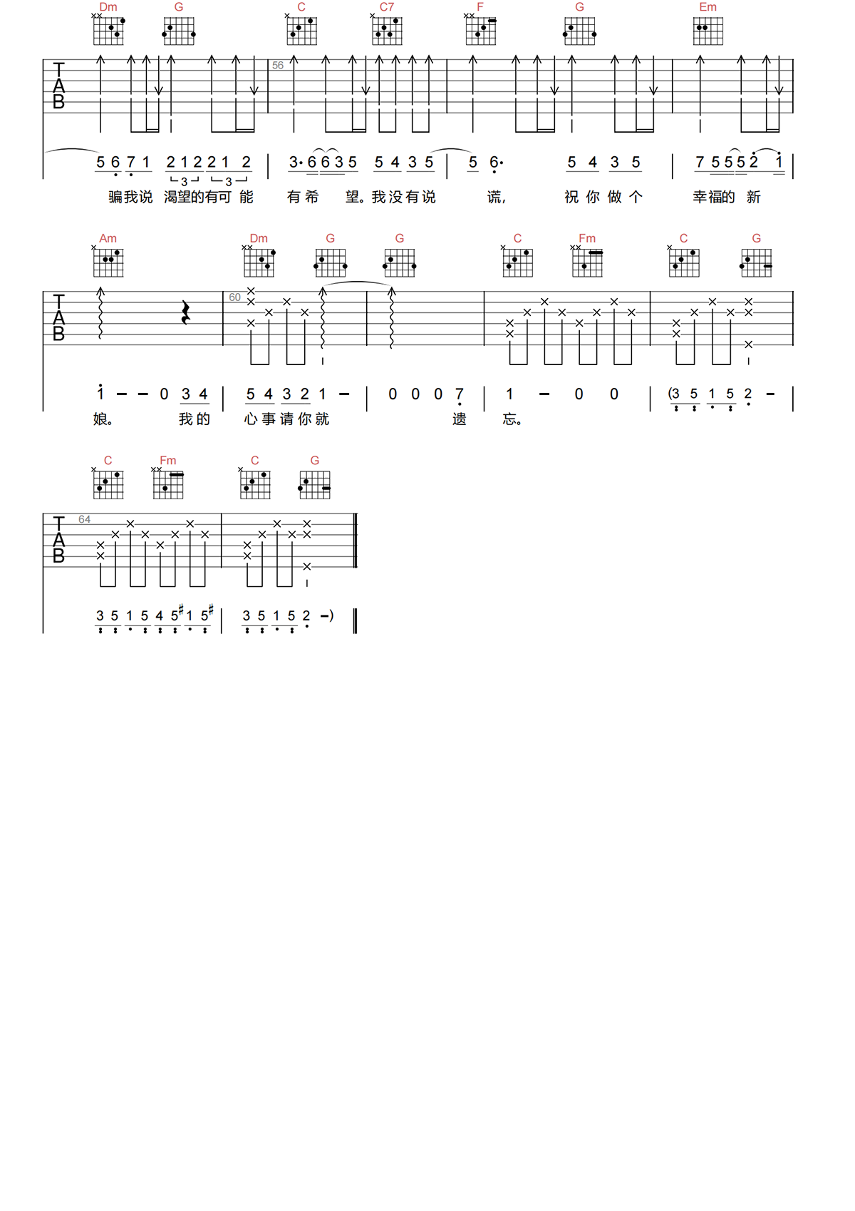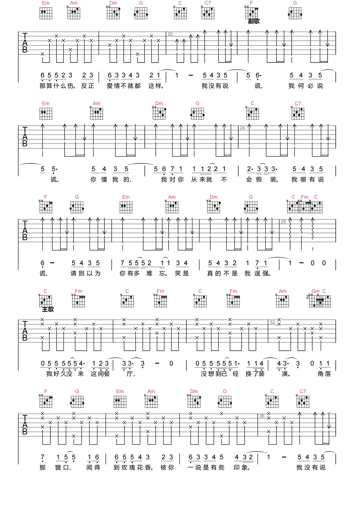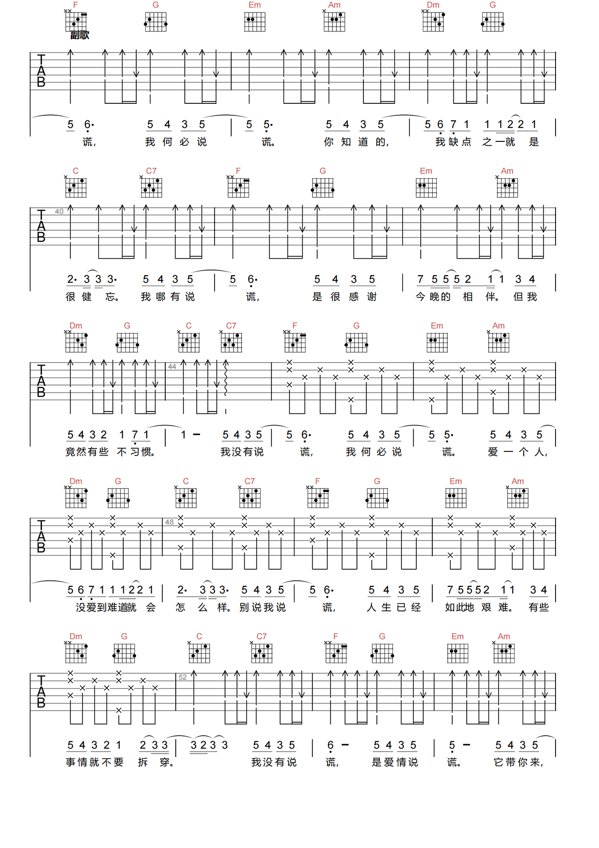 林宥嘉《说谎》吉他谱-《说谎》C调简单原版六线谱