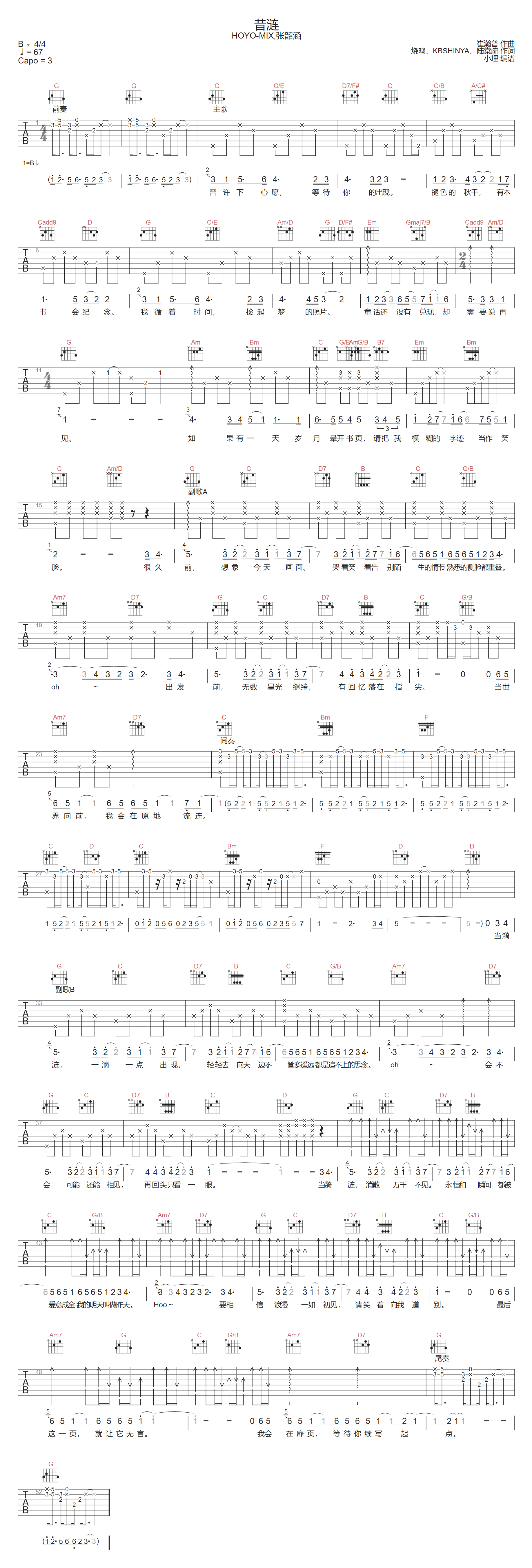 昔涟吉他谱,歌曲原调为降B调,此版本的曲谱来源于@小埋,为4/4拍的节奏,按G调指法编配,共1张高清吉他谱,变调夹3品为原歌曲的调式,演唱时可按个人音域选择合适的变调夹位置。
