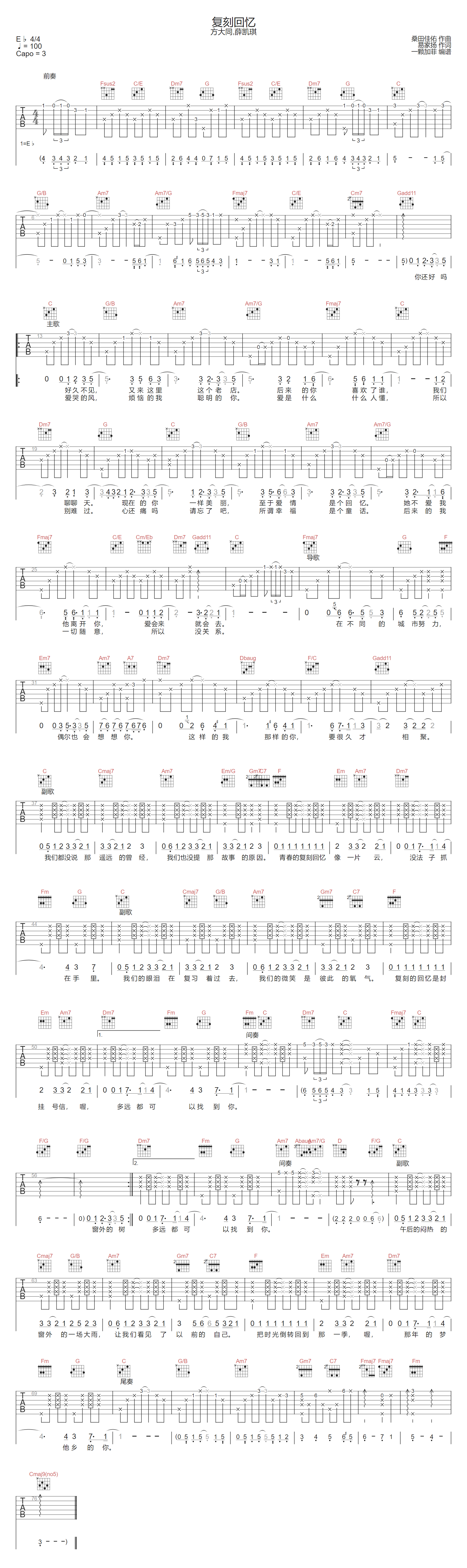 复刻回忆吉他谱,歌曲原调为降E调,此版本的曲谱来源于@一颗加菲,为4/4拍的节奏,按C调指法编配,共1张高清吉他谱,变调夹3品为原歌曲的调式,演唱时可按个人音域选择合适的变调夹位置。