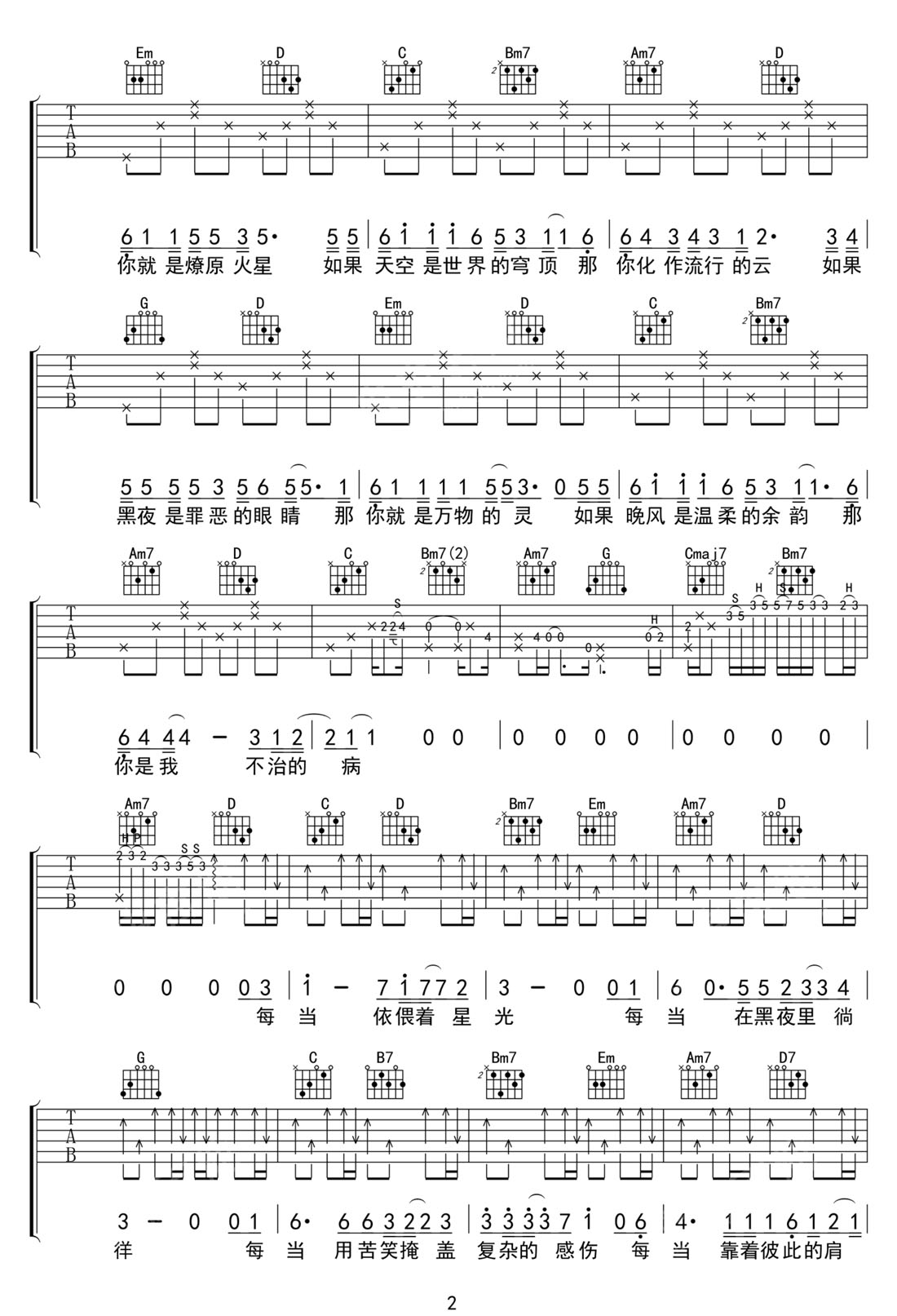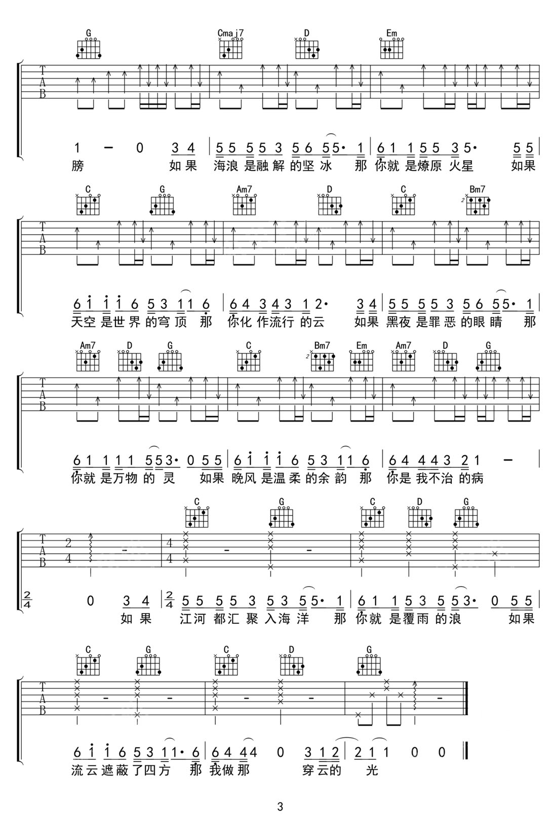 你自是你吉他谱,歌曲原调为B调,此版本的曲谱来源于@网络转载,为4/4拍的节奏,按G调指法编配,共3张高清吉他谱,变调夹4品为原歌曲的调式,演唱时可按个人音域选择合适的变调夹位置。