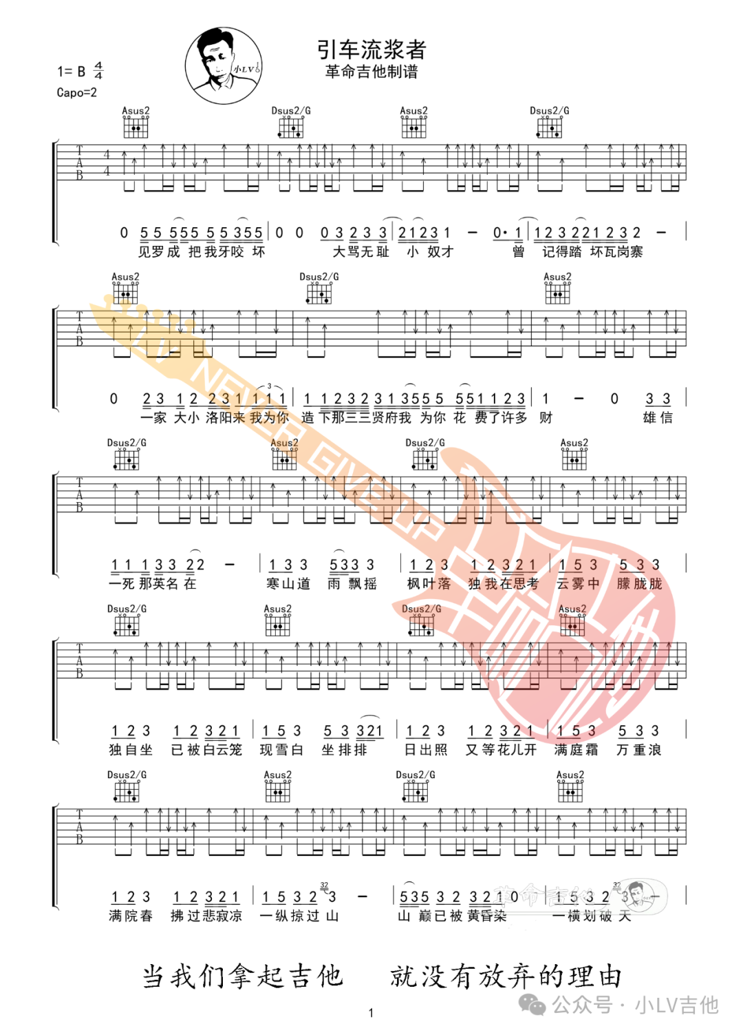 引车流浆者吉他谱,歌曲原调为B调,此版本的曲谱来源于@革命吉他,为4/4拍的节奏,按A调指法编配,共3张高清吉他谱,变调夹2品为原歌曲的调式,演唱时可按个人音域选择合适的变调夹位置。