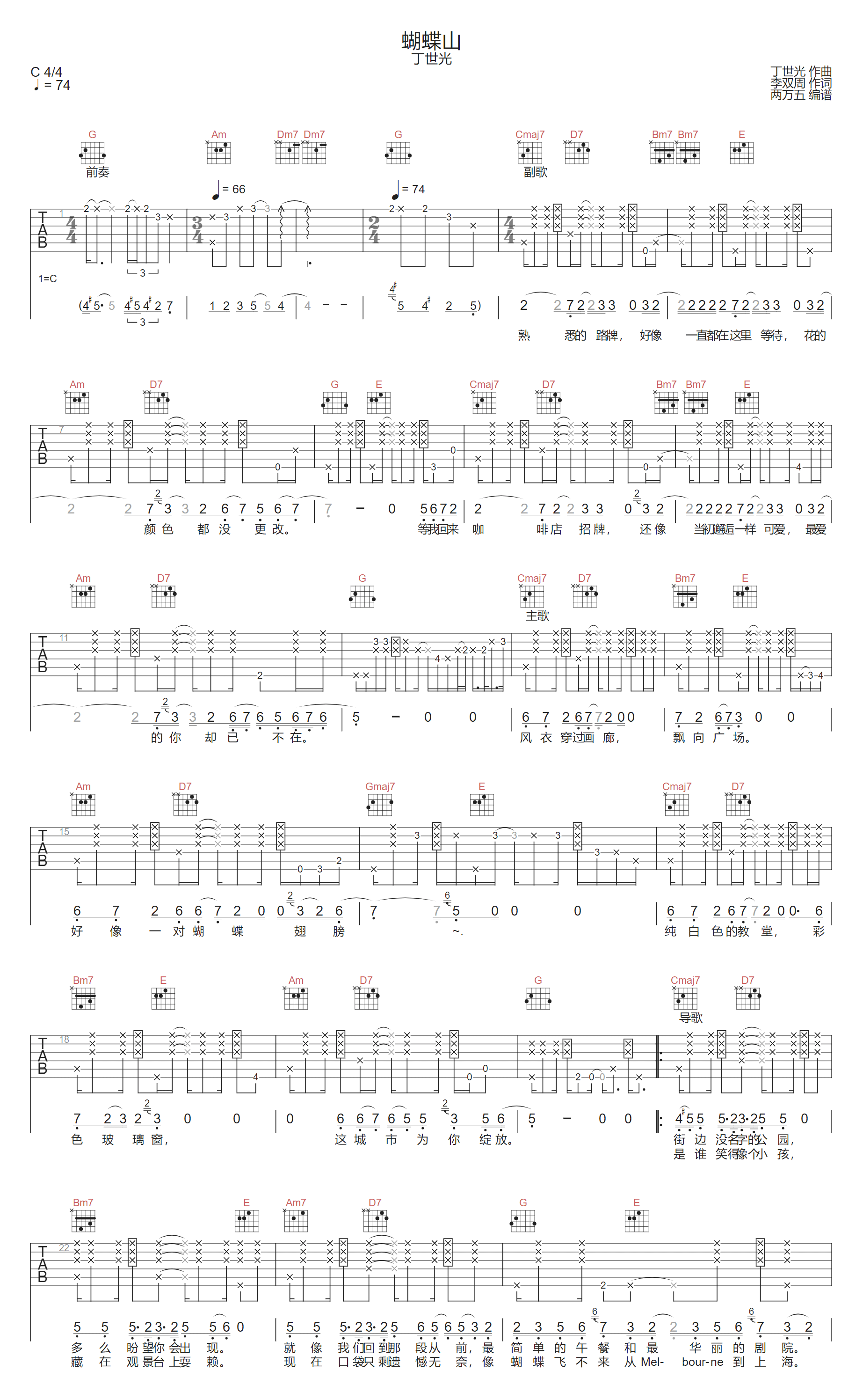 蝴蝶山吉他谱_丁世光_C调原版弹唱谱_图片六线谱