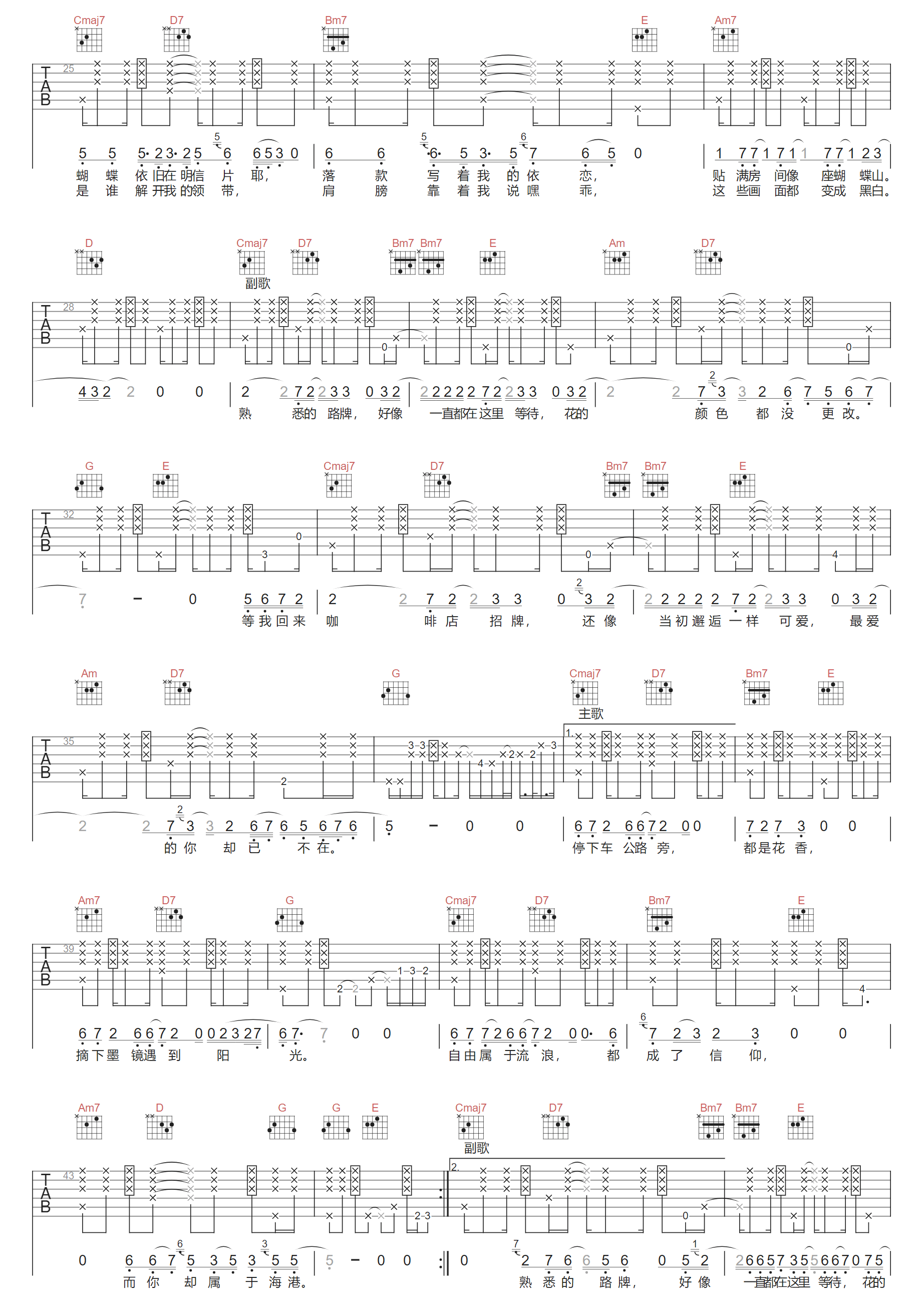 蝴蝶山吉他谱,歌曲原调为C调,此版本的曲谱来源于@两万五,为4/4拍的节奏,按C调指法编配,共3张高清吉他谱,变调夹不夹为原歌曲的调式,演唱时可按个人音域选择合适的变调夹位置。