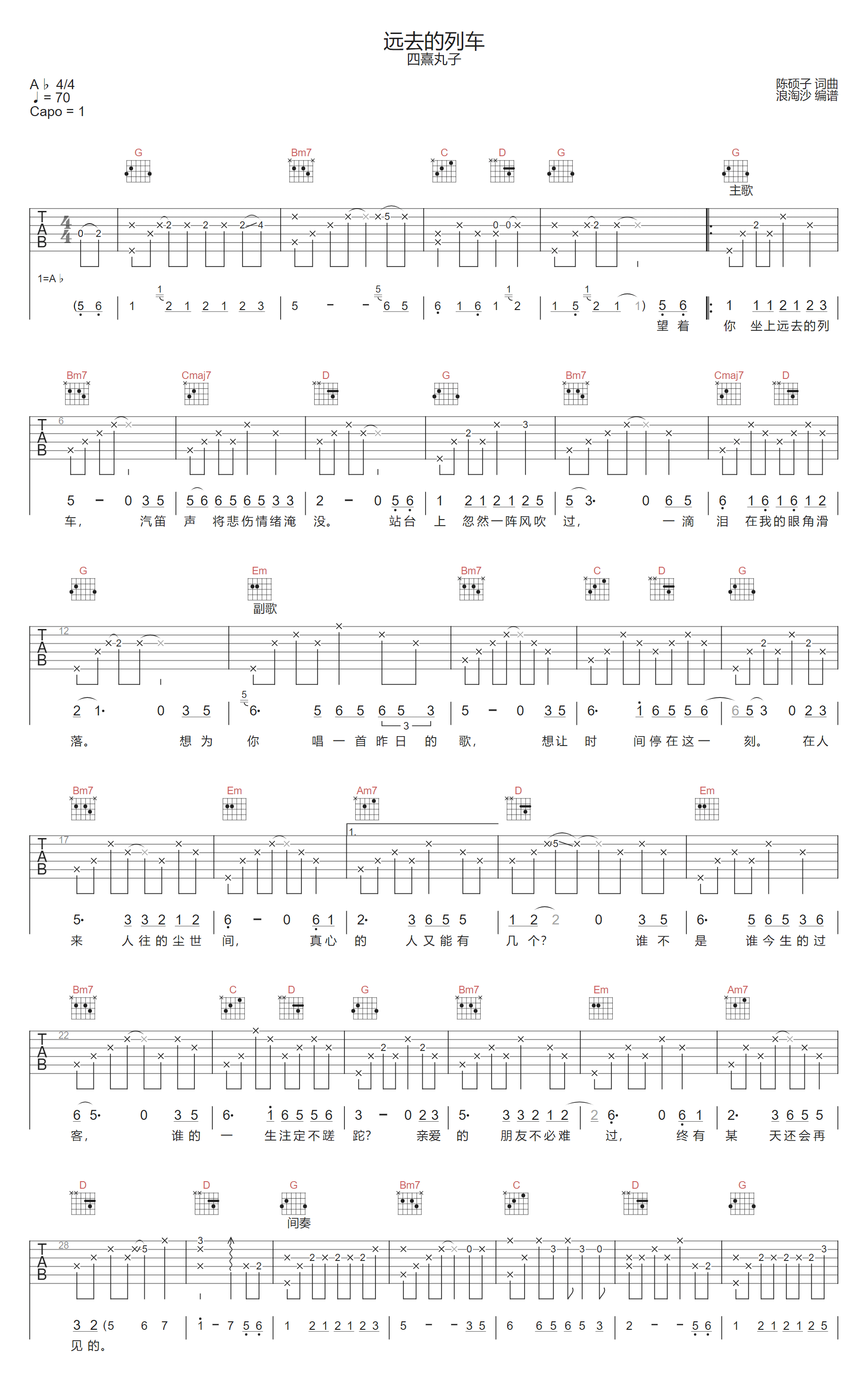 远去的列车吉他谱,歌曲原调为降A调,此版本的曲谱来源于@浪淘沙,为4/4拍的节奏,按G调指法编配,共2张高清吉他谱,变调夹1品为原歌曲的调式,演唱时可按个人音域选择合适的变调夹位置。