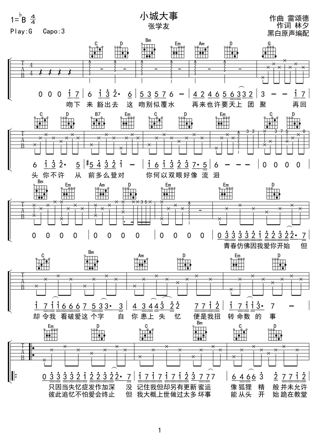 小城大事吉他谱,歌曲原调为降B调,此版本的曲谱来源于@黑白原声,为4/4拍的节奏,按G调指法编配,共3张高清吉他谱,变调夹3品为原歌曲的调式,演唱时可按个人音域选择合适的变调夹位置。