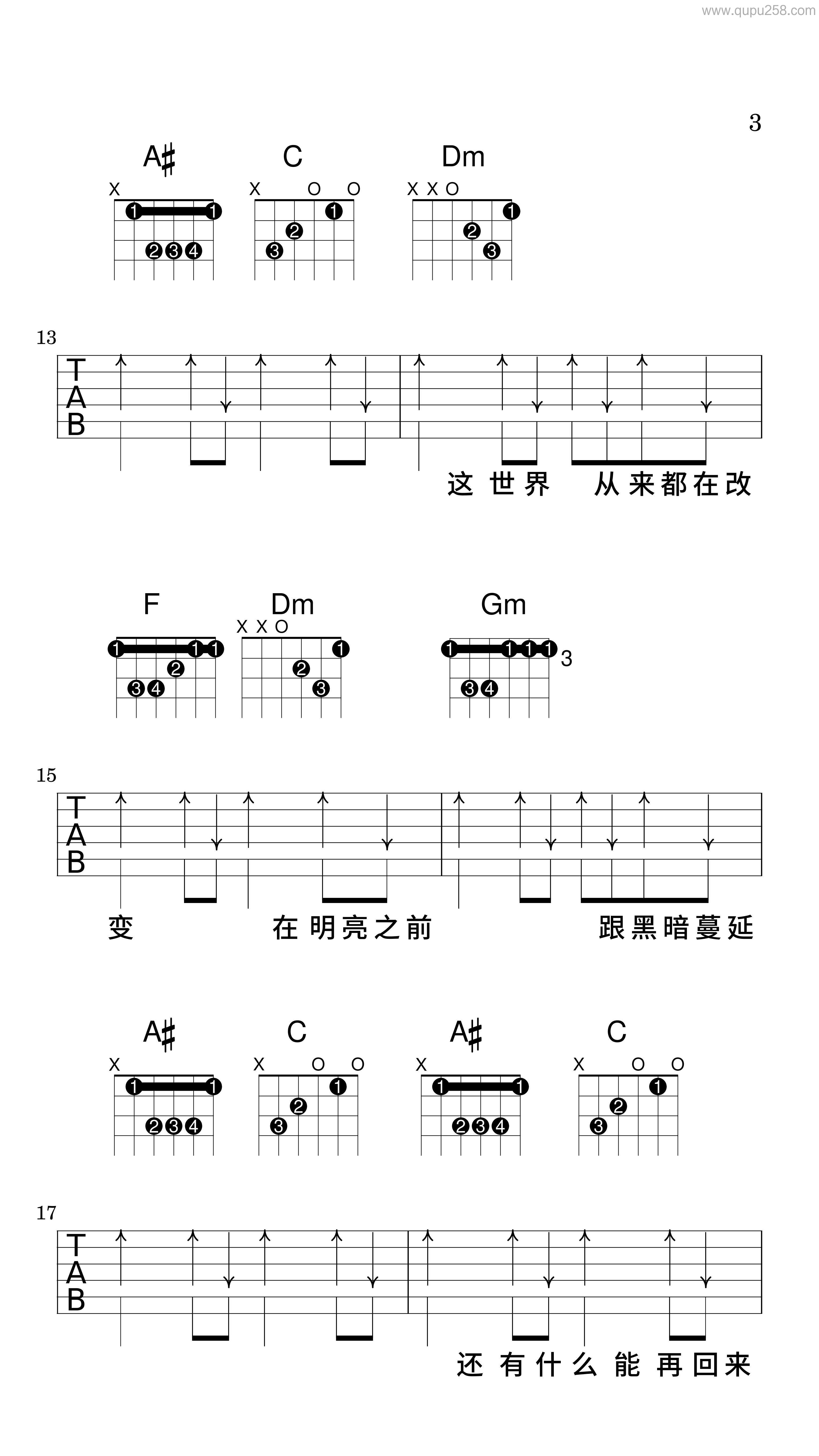 友情提示吉他谱,歌曲原调为A调,此版本的曲谱来源于@小埋,为4/4拍的节奏,按A调指法编配,共3张高清吉他谱,变调夹不夹为原歌曲的调式,演唱时可按个人音域选择合适的变调夹位置。 每一句演唱都浸着痛感,极致投入的演绎里,全是说不出口的心事与遗憾。歌词的撕心… -
