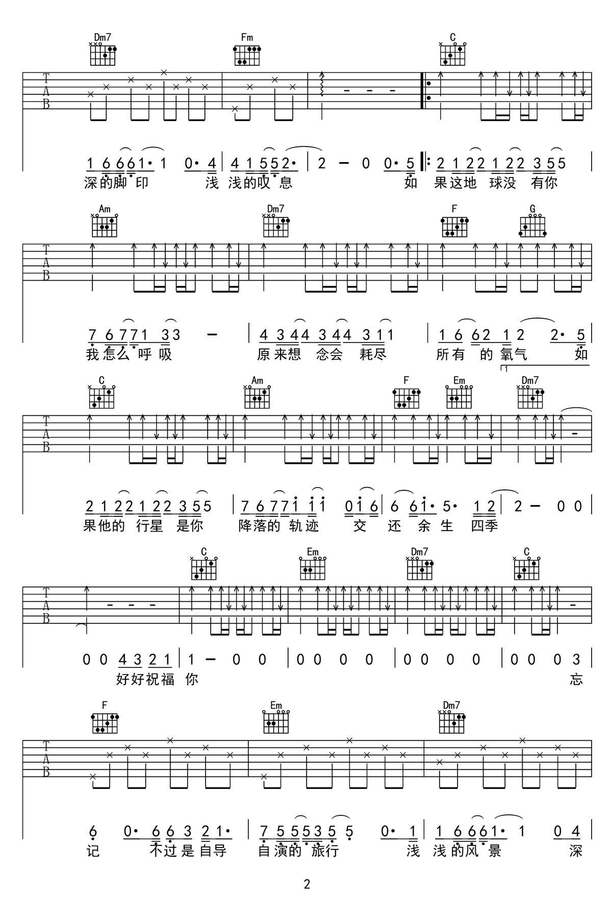 地球没有你吉他谱_周深_C调原版弹唱谱_图片六线谱