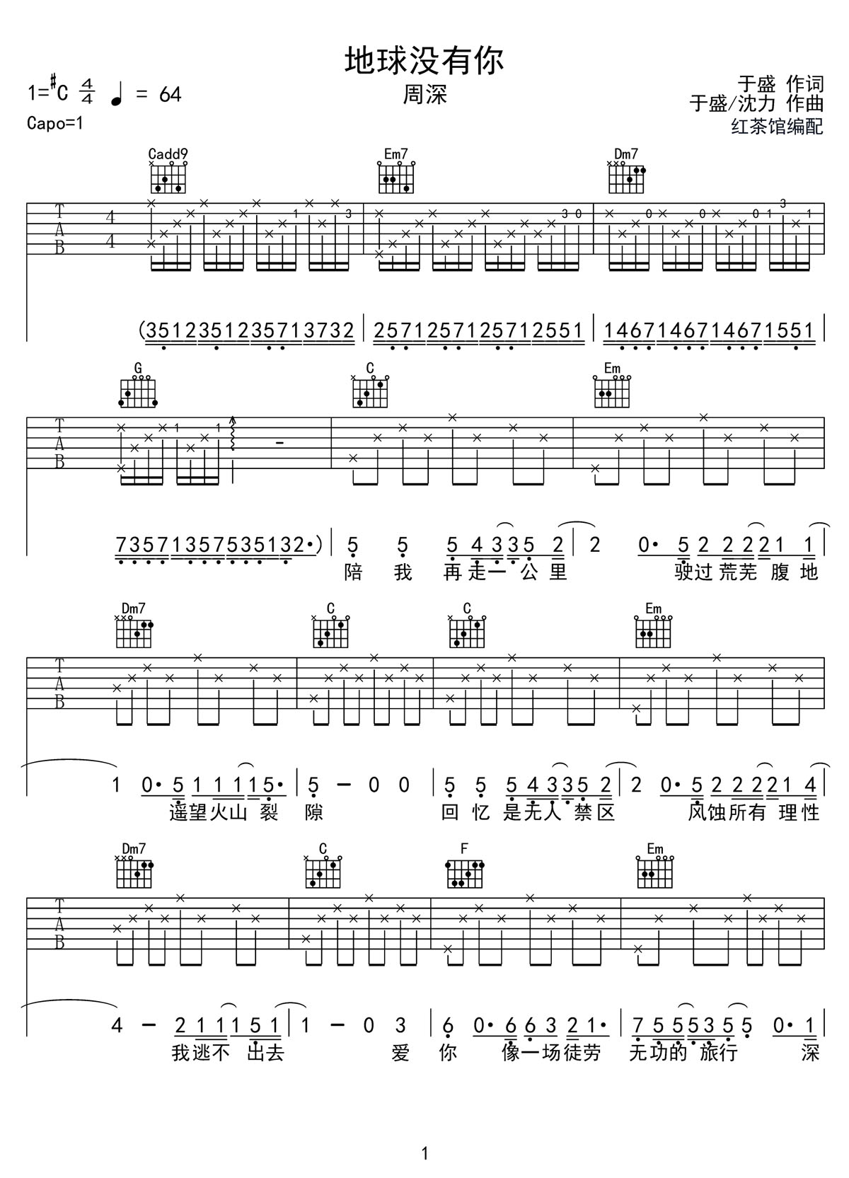 地球没有你吉他谱,歌曲原调为#C调,此版本的曲谱来源于@红茶馆,为4/4拍的节奏,按C调指法编配,共3张高清吉他谱,变调夹1品为原歌曲的调式,演唱时可按个人音域选择合适的变调夹位置。