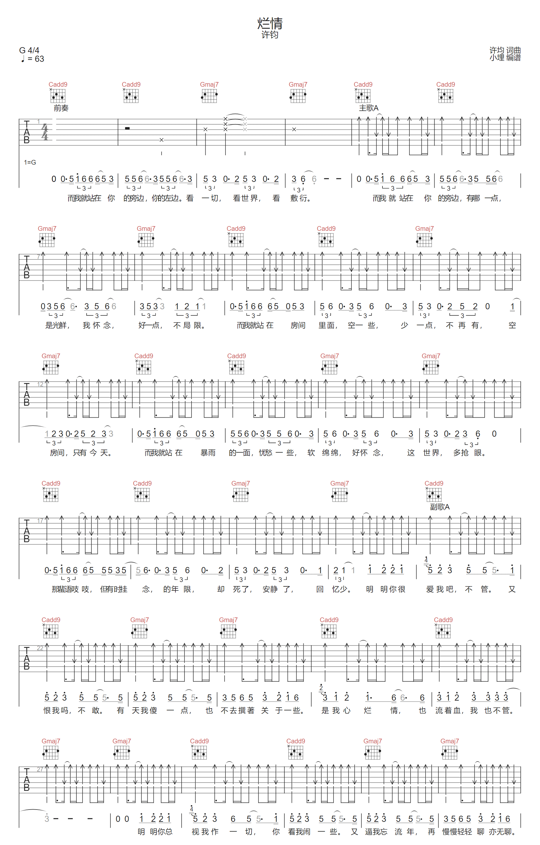 烂情吉他谱_许钧_G调扫弦版弹唱谱_图片六线谱