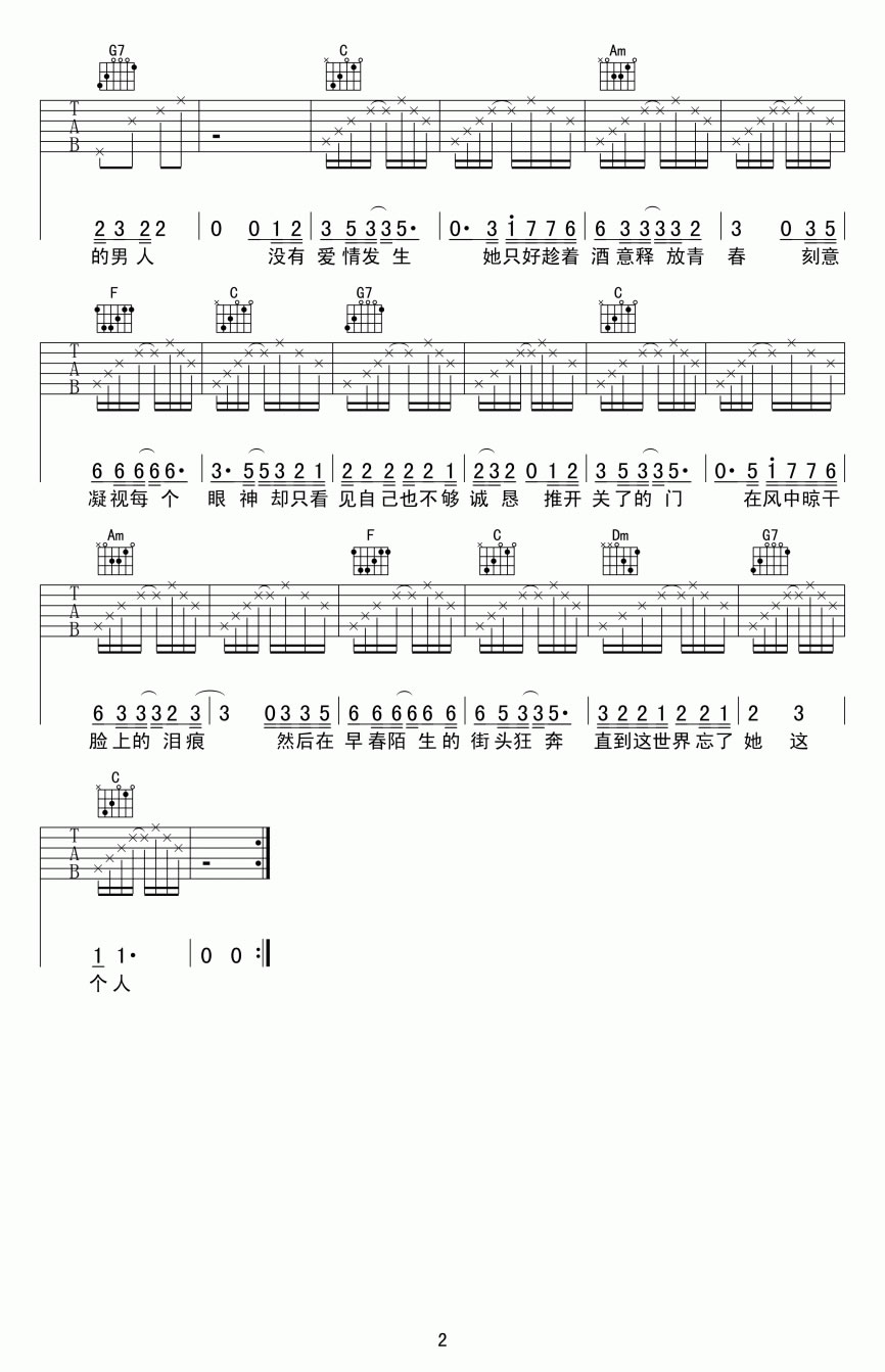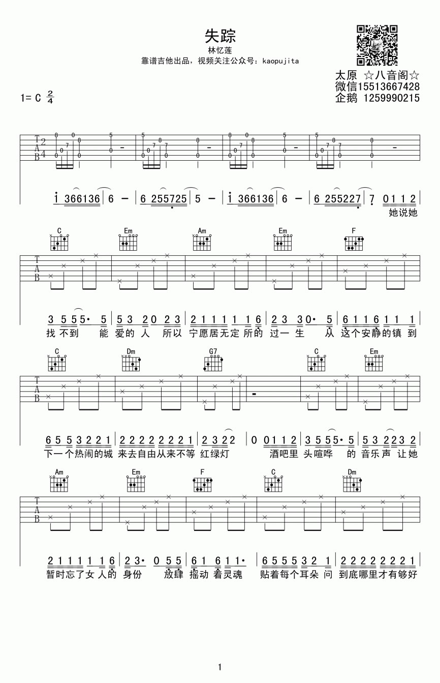 失踪吉他谱,歌曲原调为C调,此版本的曲谱来源于@靠谱吉他,为2/4拍的节奏,按C调指法编配,共2张高清吉他谱,变调夹不夹为原歌曲的调式,演唱时可按个人音域选择合适的变调夹位置。