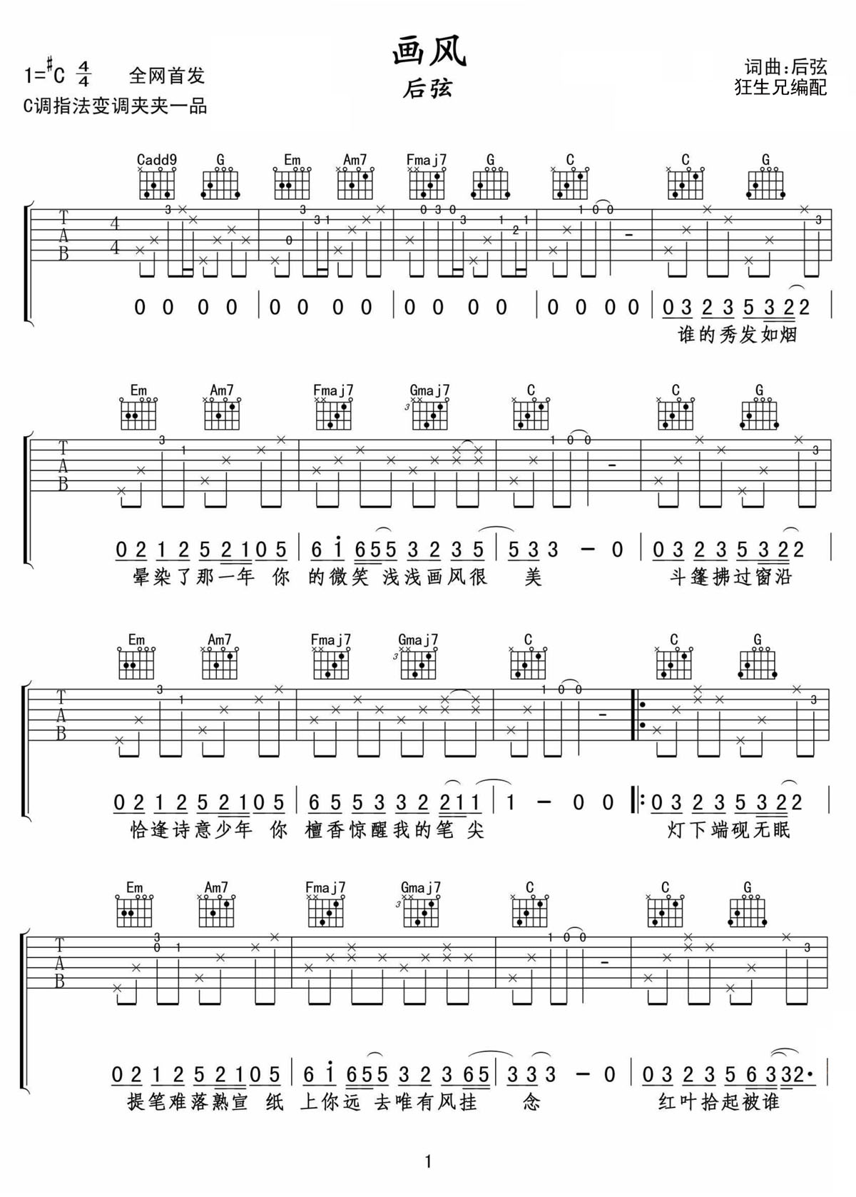 画风吉他谱,歌曲原调为#C调,此版本的曲谱来源于@狂生兄,为4/4拍的节奏,按C调指法编配,共3张高清吉他谱,变调夹1品为原歌曲的调式,演唱时可按个人音域选择合适的变调夹位置。
