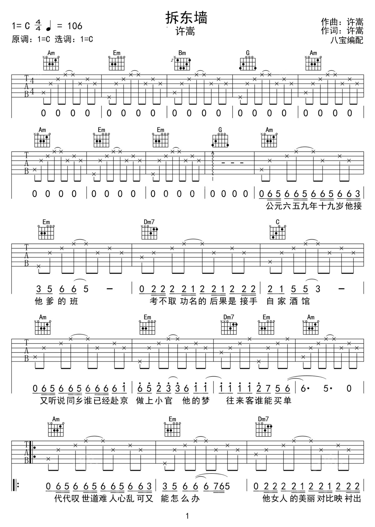 拆东墙吉他谱,歌曲原调为C调,此版本的曲谱来源于@八宝,为4/4拍的节奏,按C调指法编配,共3张高清吉他谱,变调夹不夹为原歌曲的调式,演唱时可按个人音域选择合适的变调夹位置。