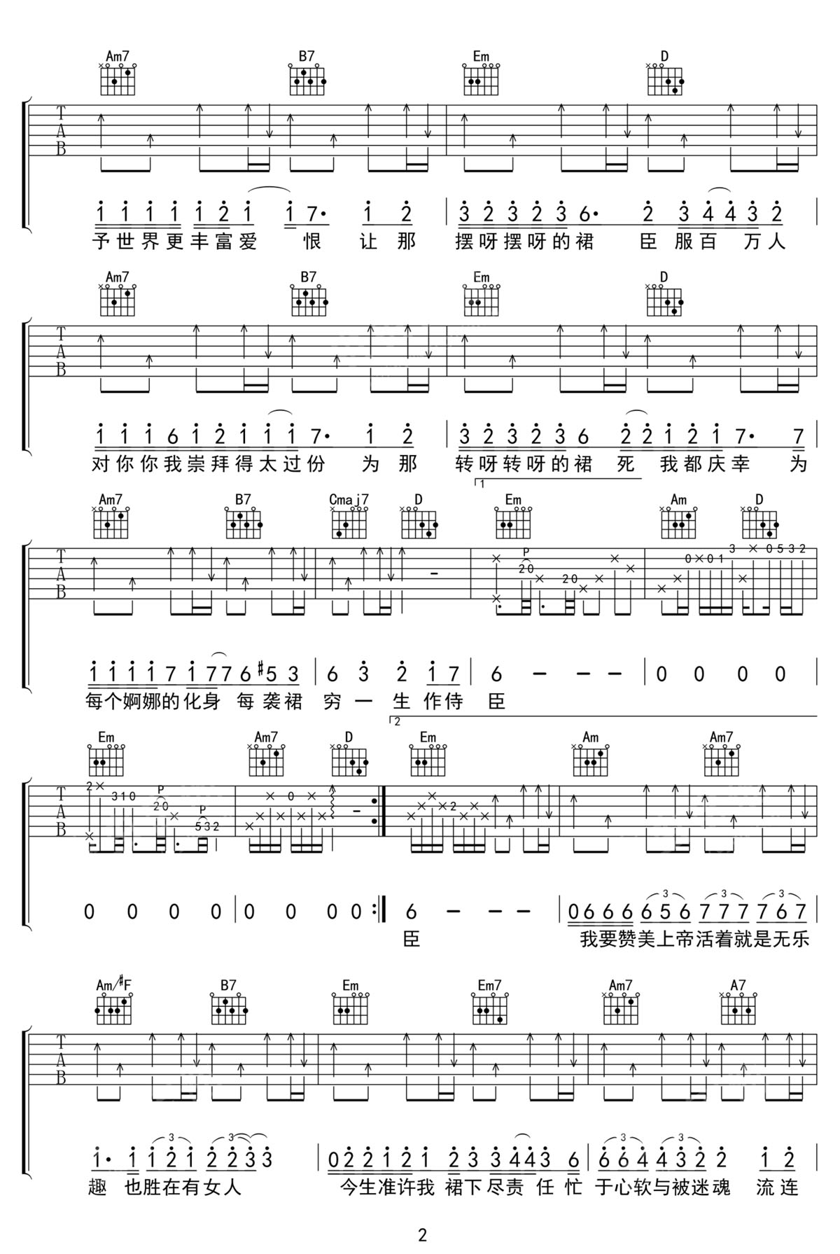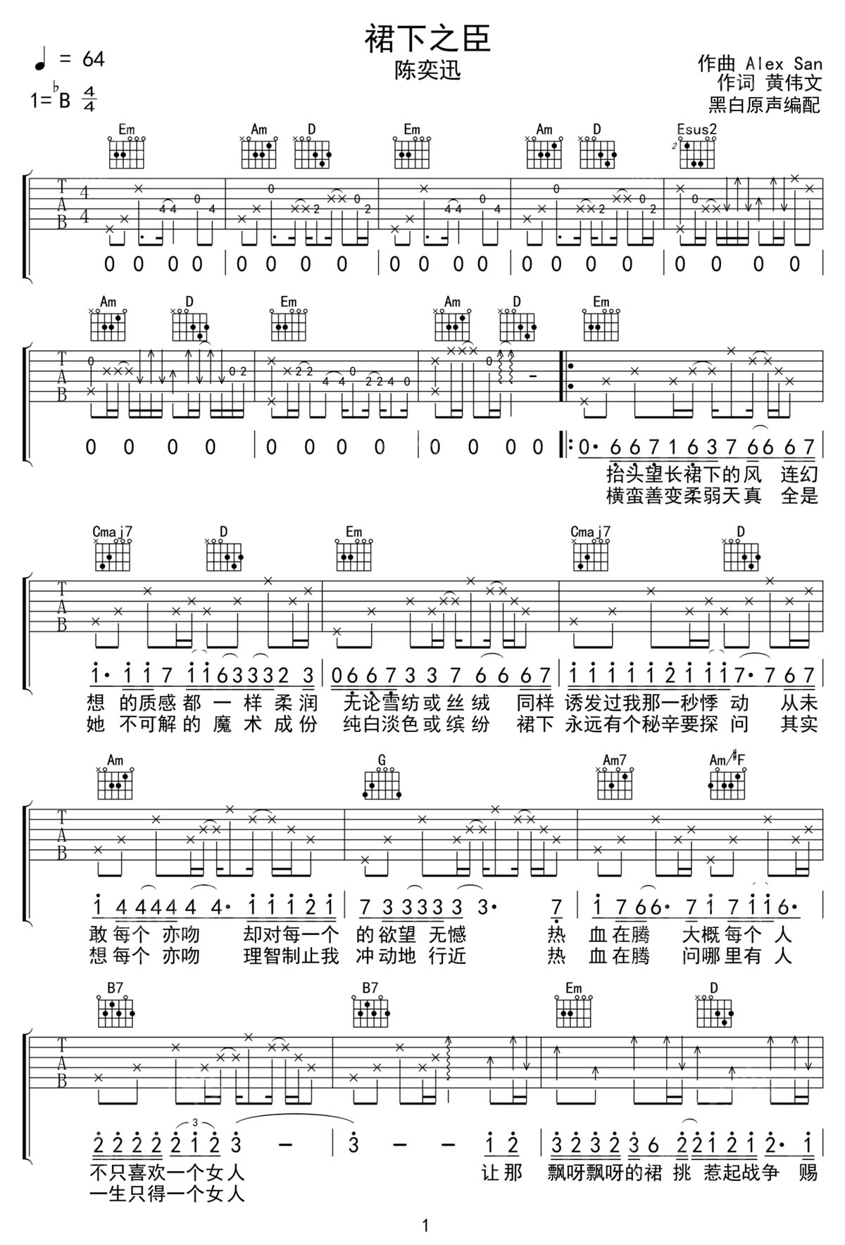 裙下之臣吉他谱,歌曲原调为降B调,此版本的曲谱来源于@黑白原声,为4/4拍的节奏,按G调指法编配,共3张高清吉他谱,变调夹3品为原歌曲的调式,演唱时可按个人音域选择合适的变调夹位置。