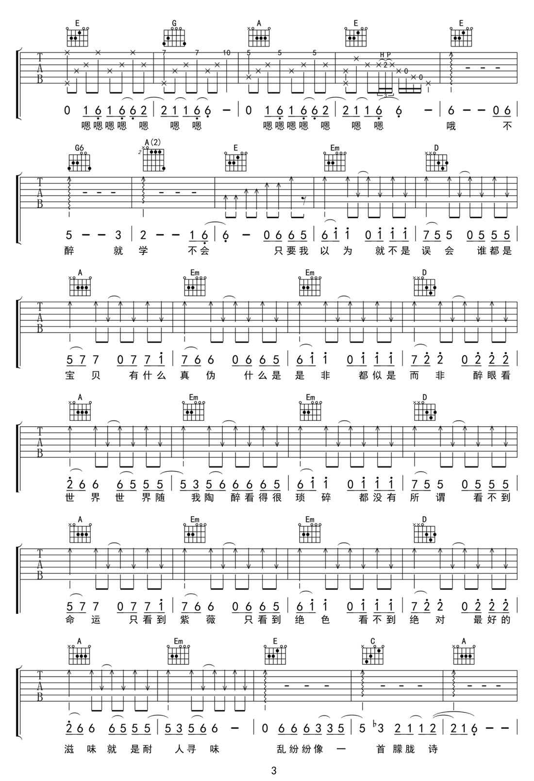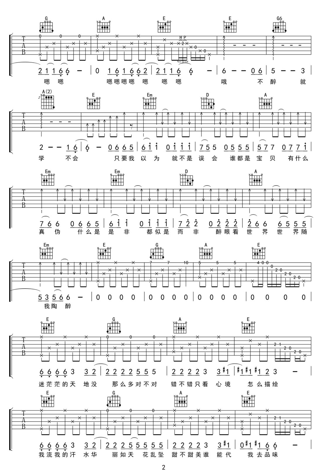 不醉不会吉他谱_田馥甄_G调原版弹唱谱_图片六线谱