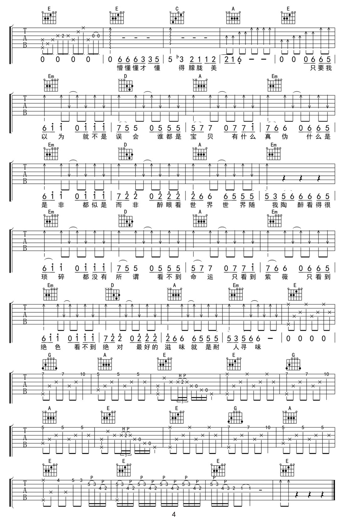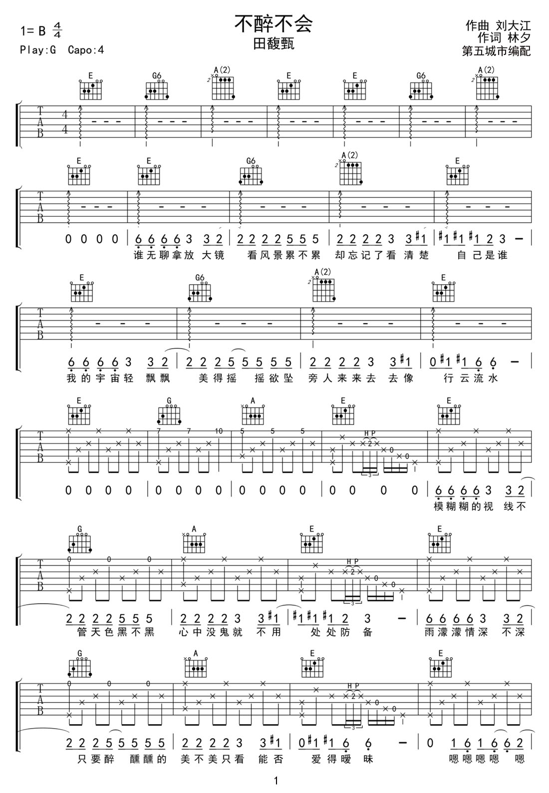 不醉不会吉他谱,歌曲原调为B调,此版本的曲谱来源于@网络转载,为4/4拍的节奏,按G调指法编配,共4张高清吉他谱,变调夹4品为原歌曲的调式,演唱时可按个人音域选择合适的变调夹位置。