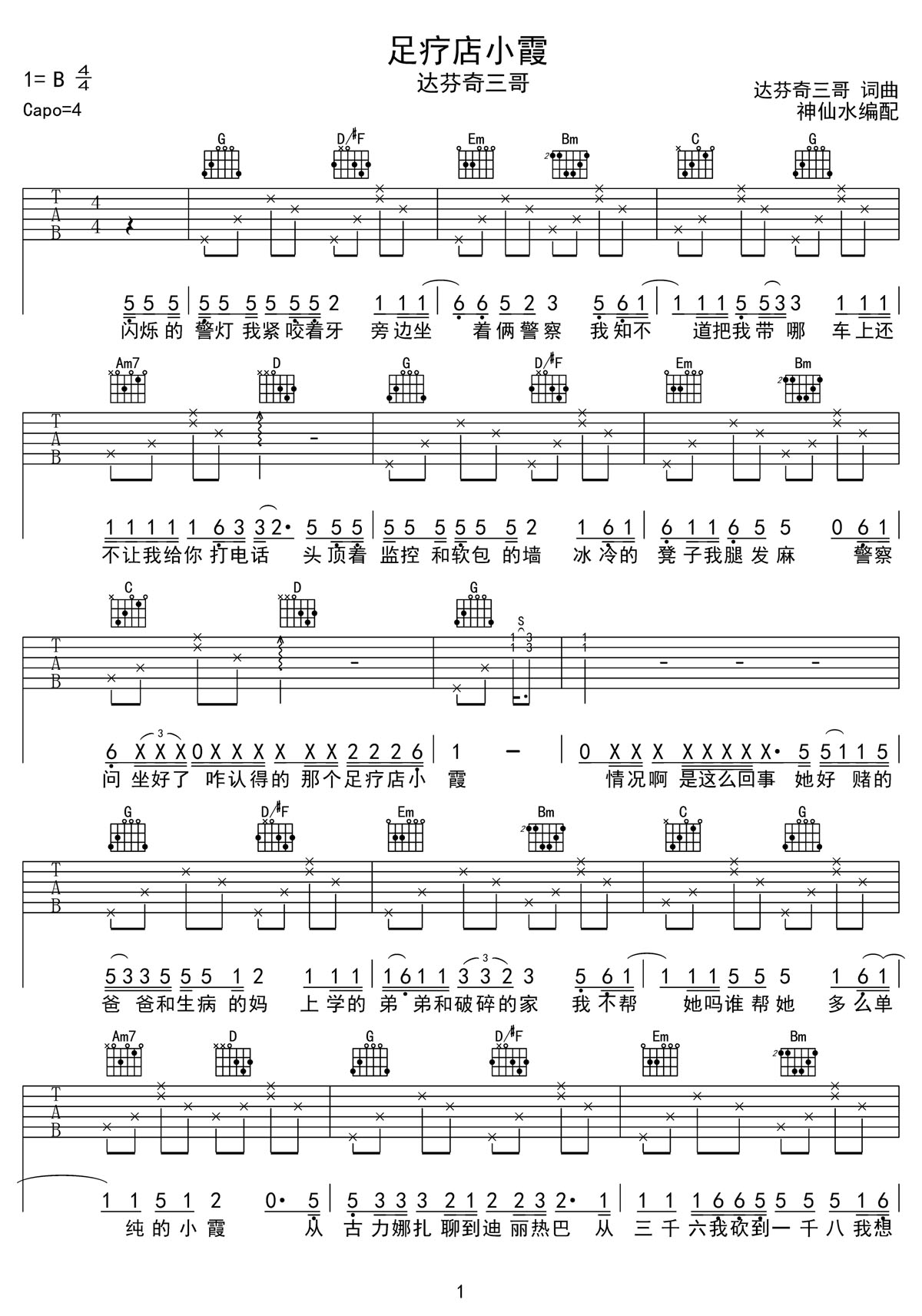 足疗店小霞吉他谱,歌曲原调为B调,此版本的曲谱来源于@神仙水,为4/4拍的节奏,按G调指法编配,共2张高清吉他谱,变调夹4品为原歌曲的调式,演唱时可按个人音域选择合适的变调夹位置。