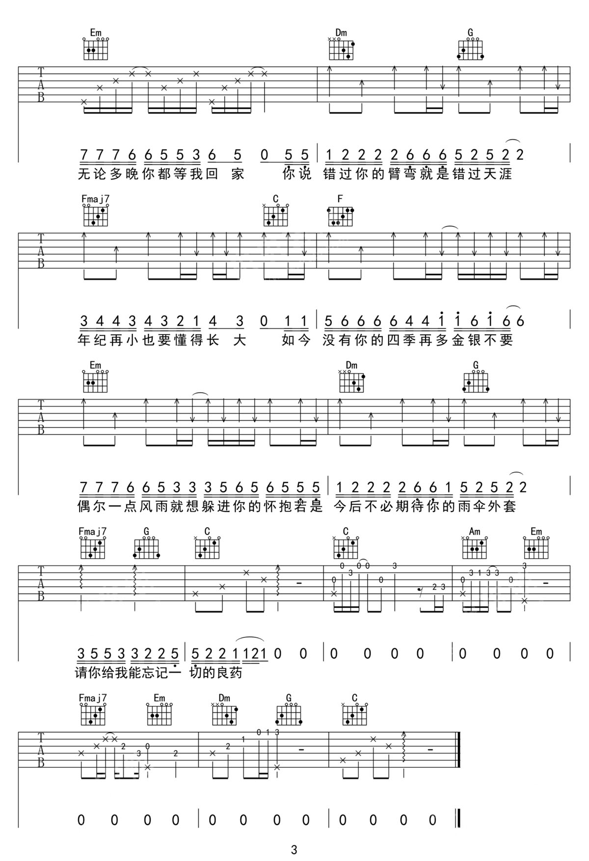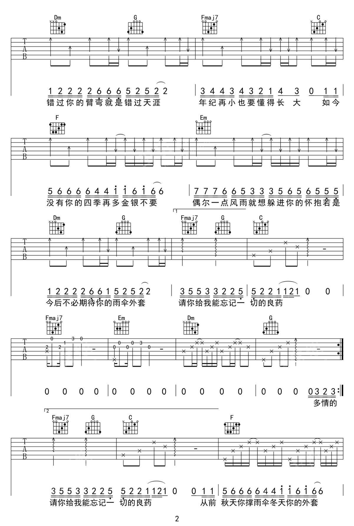 从前你吉他谱,歌曲原调为#F调,此版本的曲谱来源于@52JT,为4/4拍的节奏,按C调指法编配,共3张高清吉他谱,变调夹6品为原歌曲的调式,演唱时可按个人音域选择合适的变调夹位置。