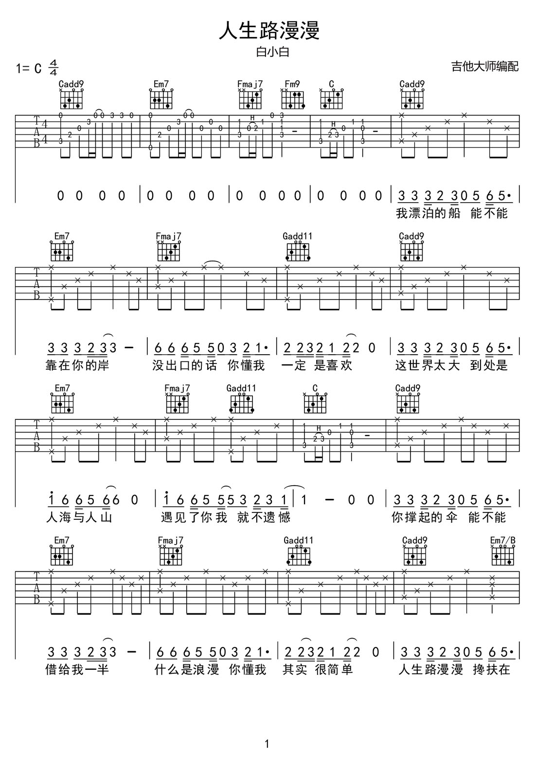 人生路漫漫吉他谱_白小白_C调原版弹唱谱_图片六线谱