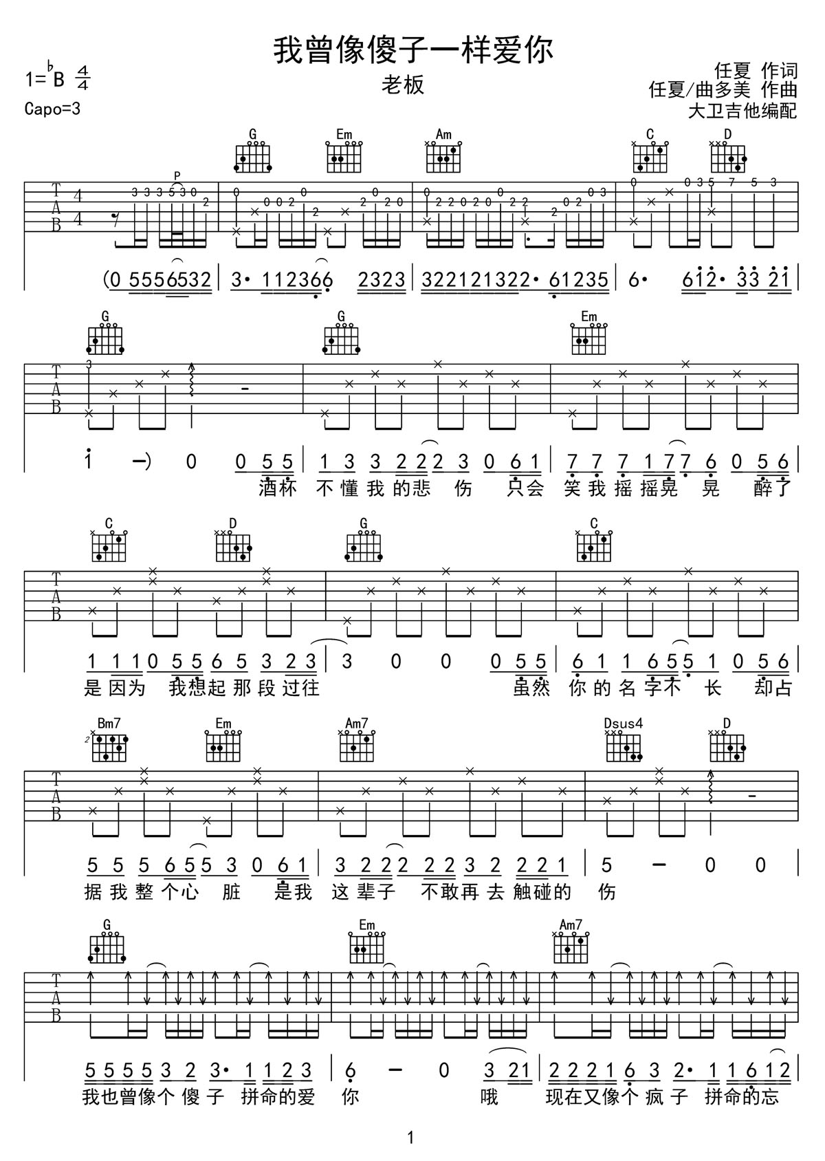 我曾像傻子一样爱你吉他谱,歌曲原调为降B调,此版本的曲谱来源于@大卫吉他,为4/4拍的节奏,按G调指法编配,共2张高清吉他谱,变调夹3品为原歌曲的调式,演唱时可按个人音域选择合适的变调夹位置。