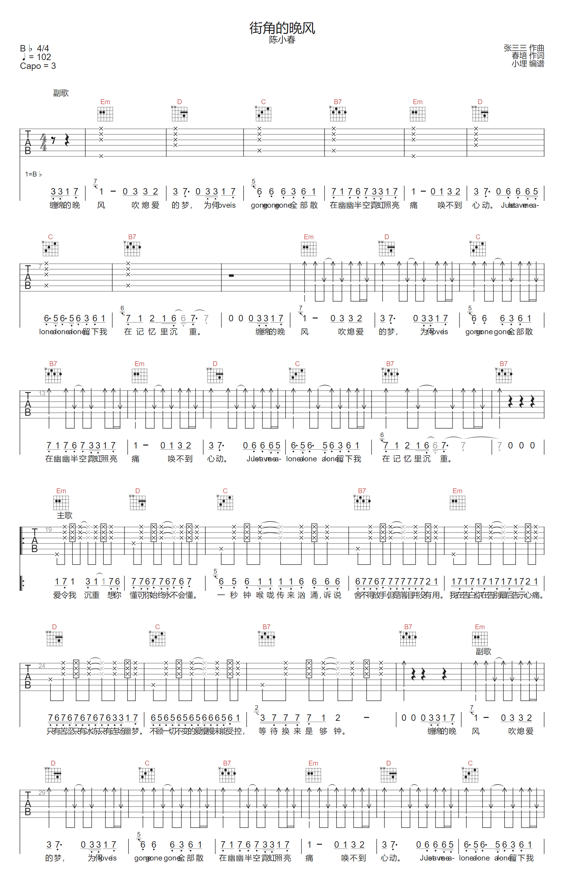 街角的晚风吉他谱,歌曲原调为降B调,此版本的曲谱来源于@小埋,为4/4拍的节奏,按G调指法编配,共3张高清吉他谱,变调夹3品为原歌曲的调式,演唱时可按个人音域选择合适的变调夹位置。