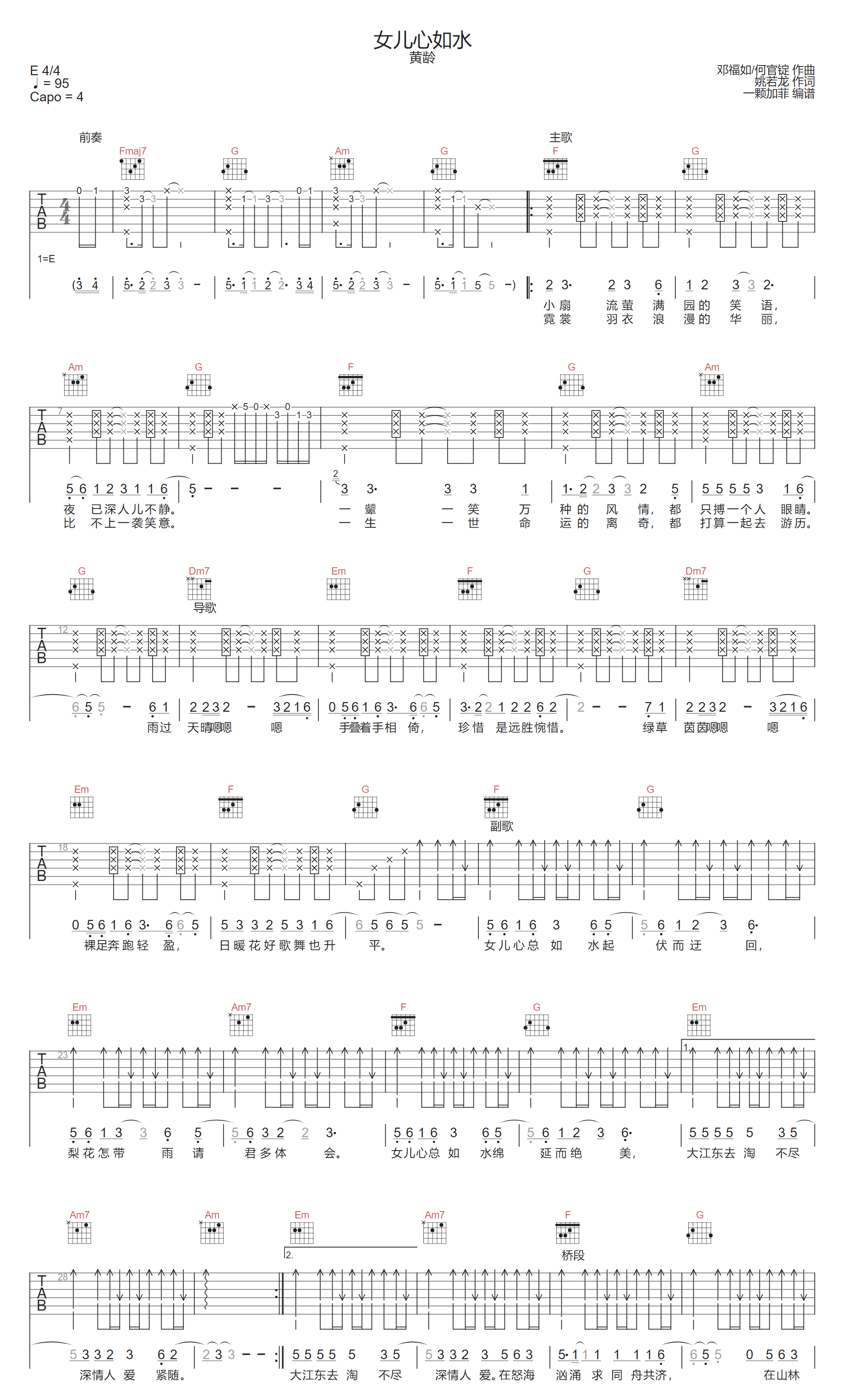 女儿心如水吉他谱,歌曲原调为E调,此版本的曲谱来源于@一颗加菲,为4/4拍的节奏,按C调指法编配,共2张高清吉他谱,变调夹4品为原歌曲的调式,演唱时可按个人音域选择合适的变调夹位置。