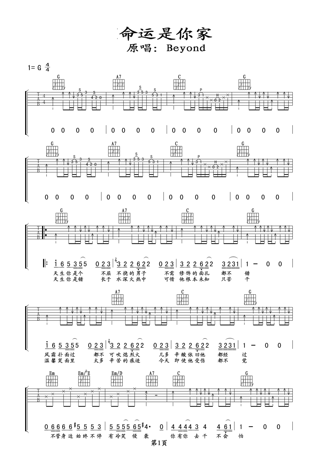 命运是你家吉他谱_Beyond_G调原版弹唱谱_图片六线谱