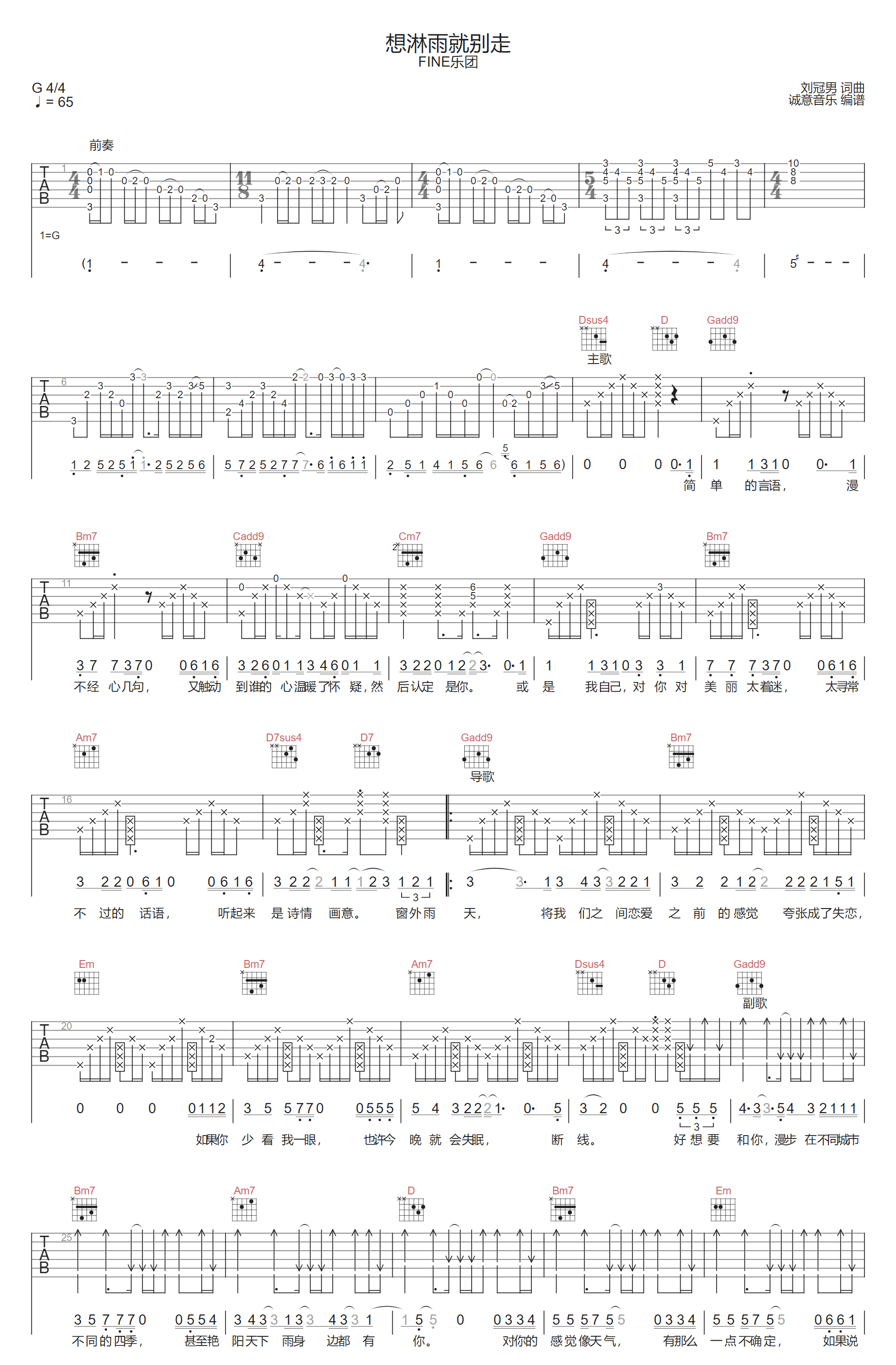 想淋雨就别走吉他谱,歌曲原调为G调,此版本的曲谱来源于@诚意音乐,为4/4拍的节奏,按G调指法编配,共2张高清吉他谱,变调夹不夹为原歌曲的调式,演唱时可按个人音域选择合适的变调夹位置。
