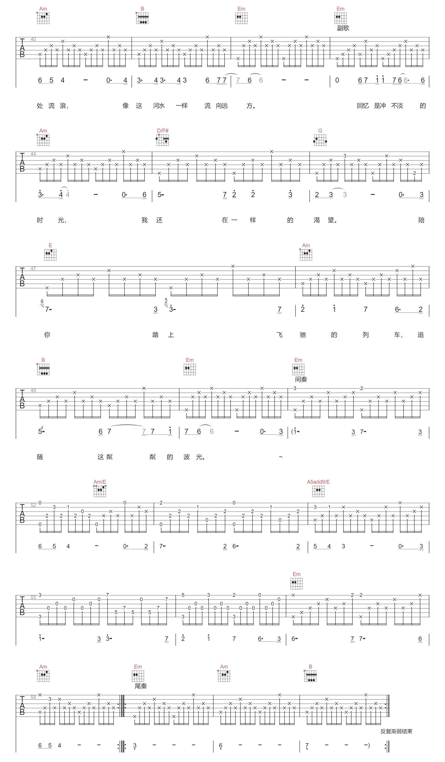 随风而去吉他谱,歌曲原调为G调,此版本的曲谱来源于@天音吉他,为4/4拍的节奏,按G调指法编配,共3张高清吉他谱,变调夹不夹为原歌曲的调式,演唱时可按个人音域选择合适的变调夹位置。 歌曲由伍佰与乐队China Blue共同演绎,音乐风格融合了摇滚元素,表达了爱情逝… -