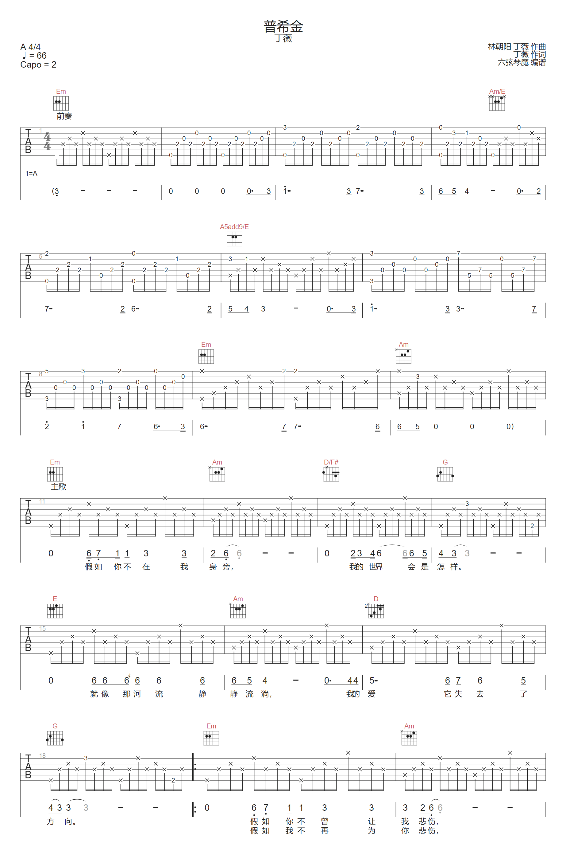 普希金吉他谱_丁薇_G调原版弹唱谱_图片六线谱