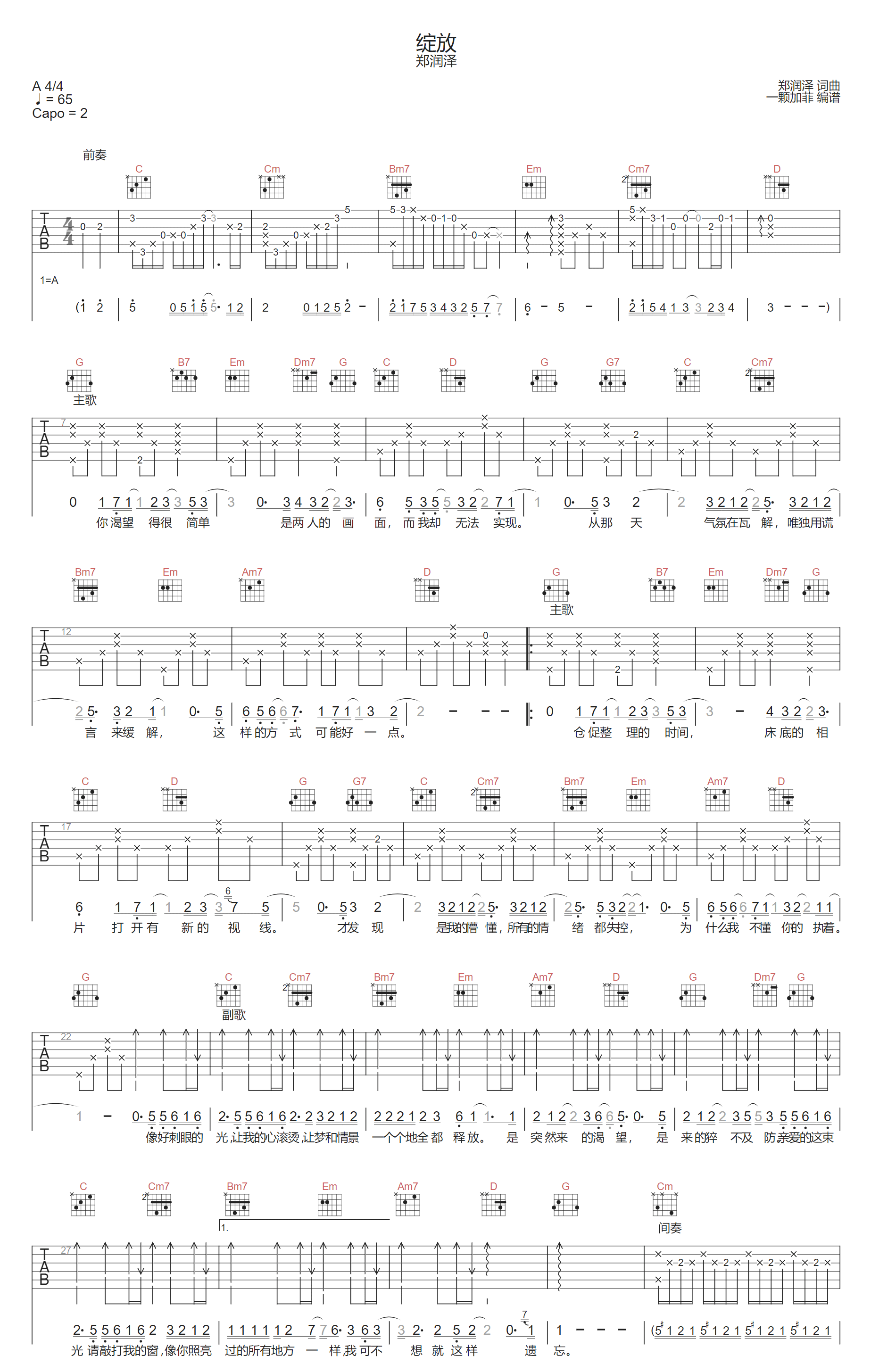 绽放吉他谱,歌曲原调为A调,此版本的曲谱来源于@一颗加菲,为4/4拍的节奏,按G调指法编配,共2张高清吉他谱,变调夹2品为原歌曲的调式,演唱时可按个人音域选择合适的变调夹位置。