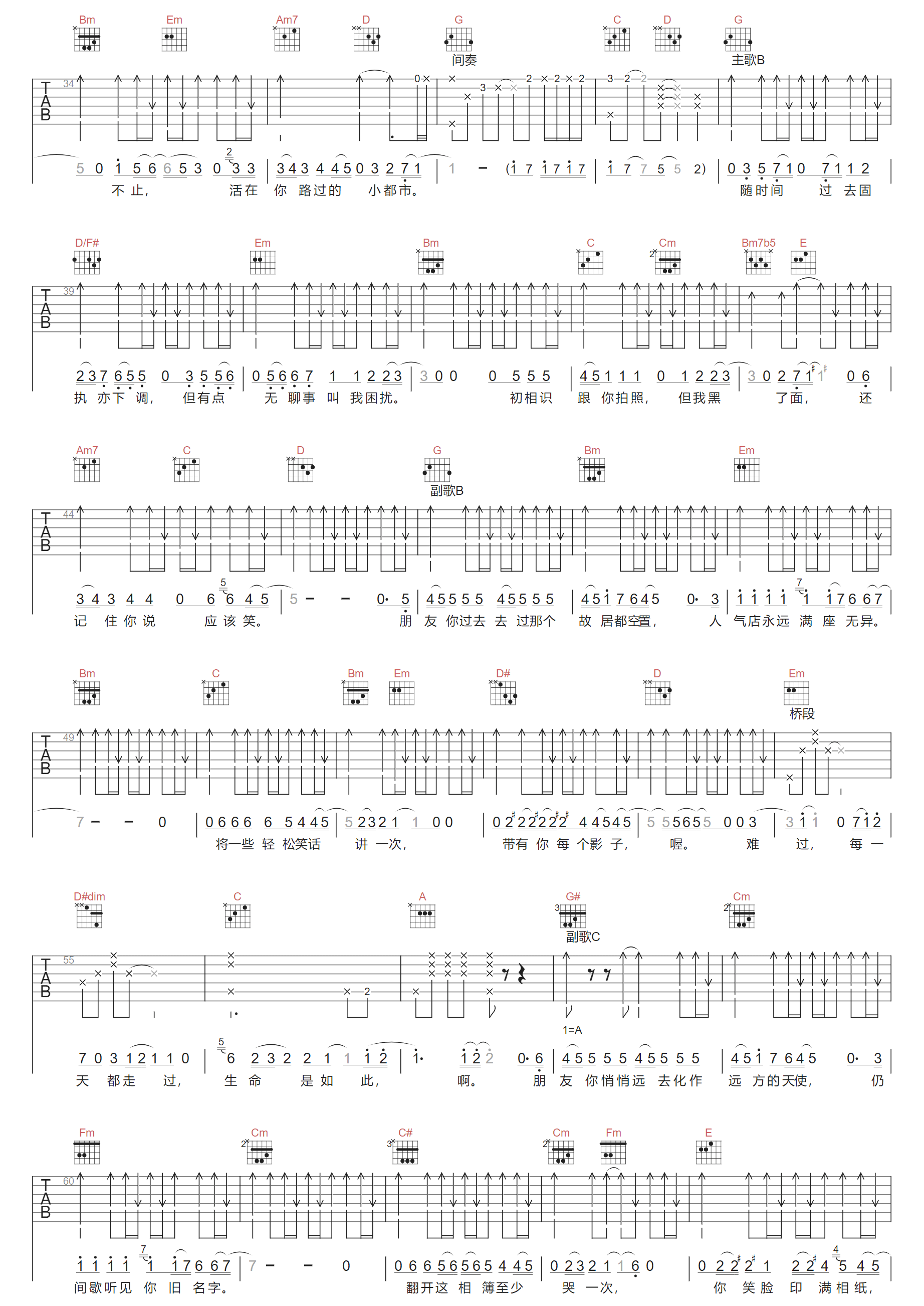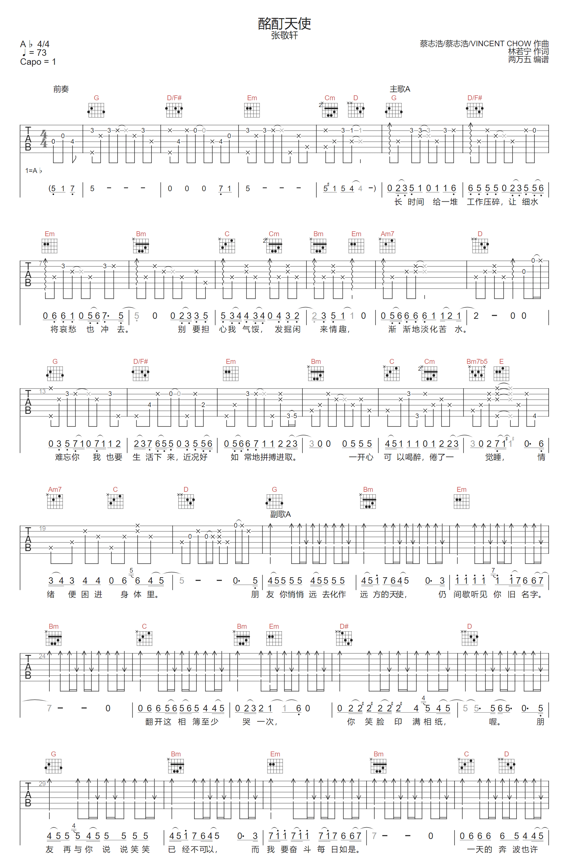 酩酊天使吉他谱,歌曲原调为降A调,此版本的曲谱来源于@两万五,为4/4拍的节奏,按G调指法编配,共3张高清吉他谱,变调夹1品为原歌曲的调式,演唱时可按个人音域选择合适的变调夹位置。