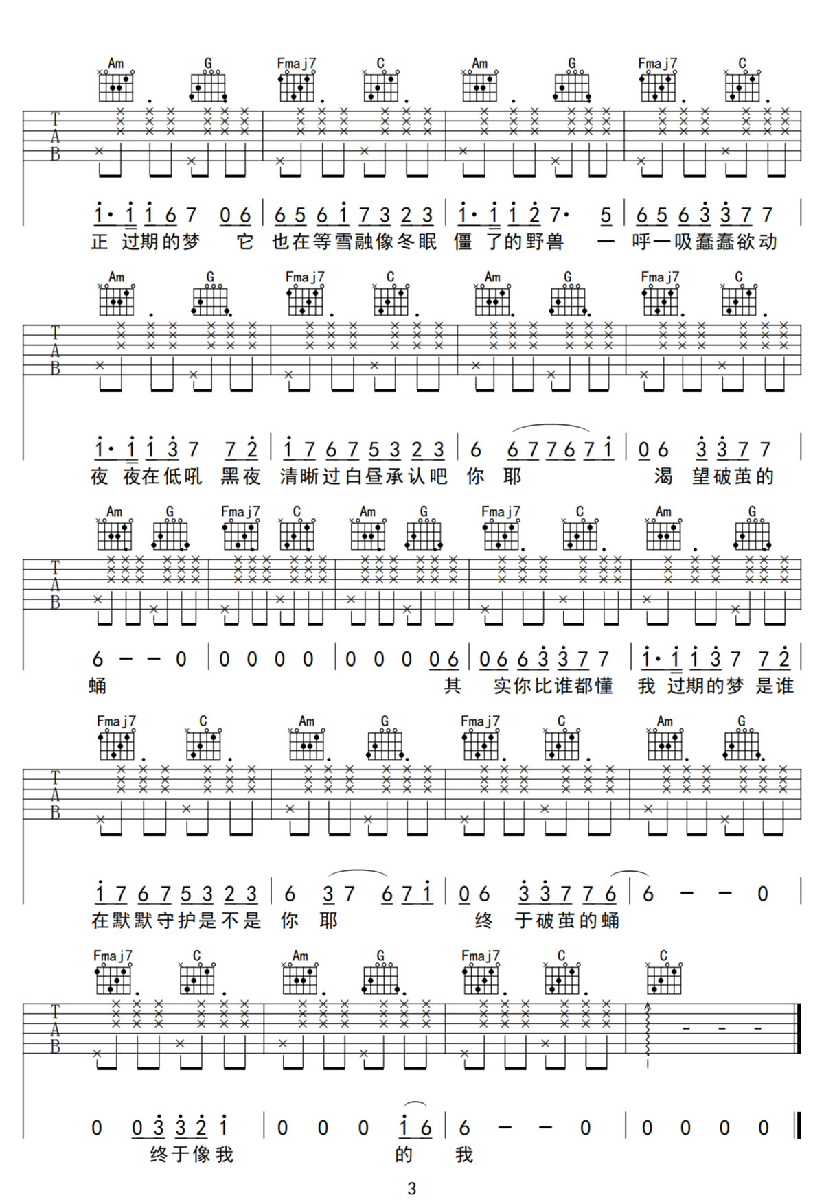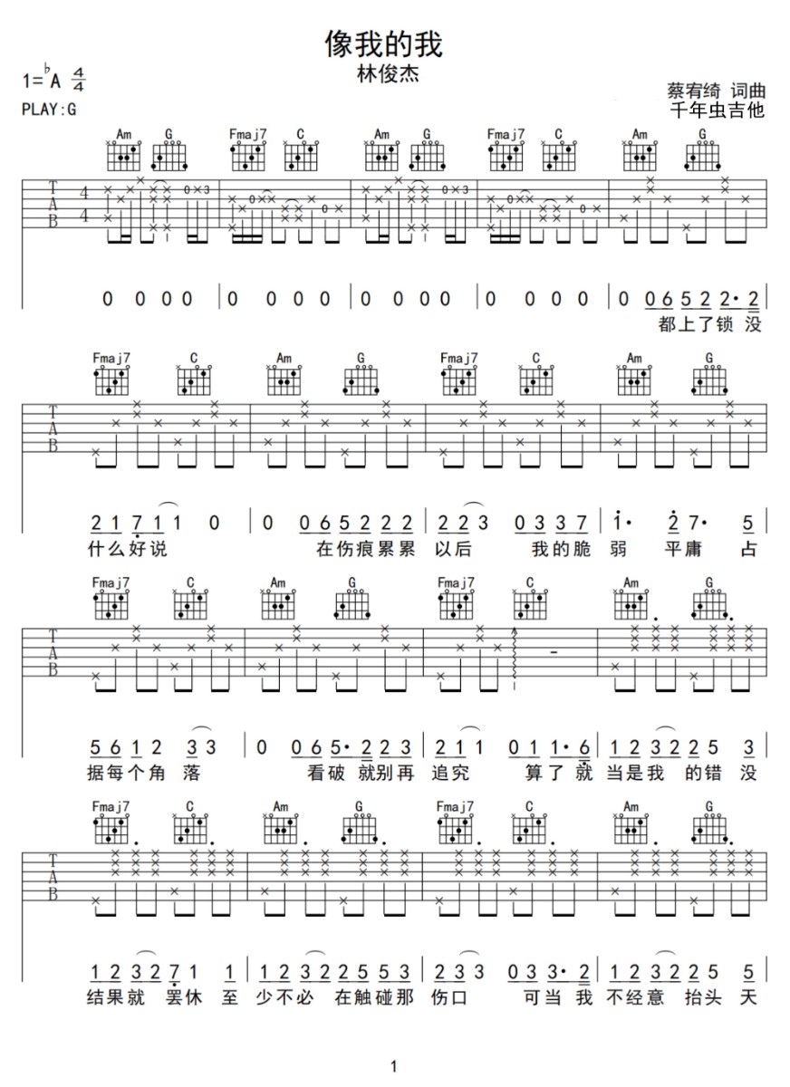 像我的我吉他谱,歌曲原调为降A调,此版本的曲谱来源于@千年虫,为4/4拍的节奏,按G调指法编配,共3张高清吉他谱,变调夹1品为原歌曲的调式,演唱时可按个人音域选择合适的变调夹位置。