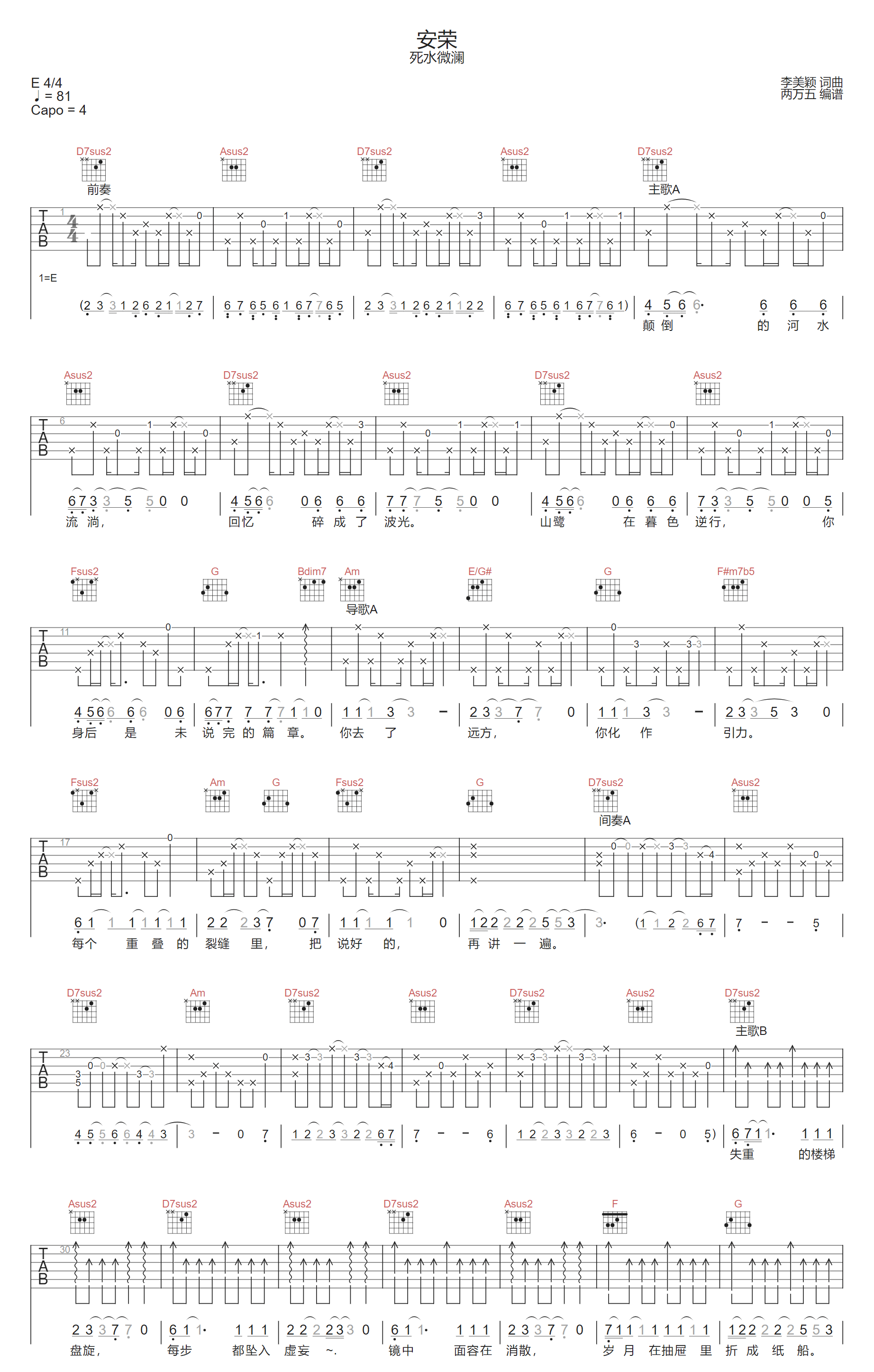 安荣吉他谱,歌曲原调为E调,此版本的曲谱来源于@两万五,为4/4拍的节奏,按C调指法编配,共3张高清吉他谱,变调夹4品为原歌曲的调式,演唱时可按个人音域选择合适的变调夹位置。