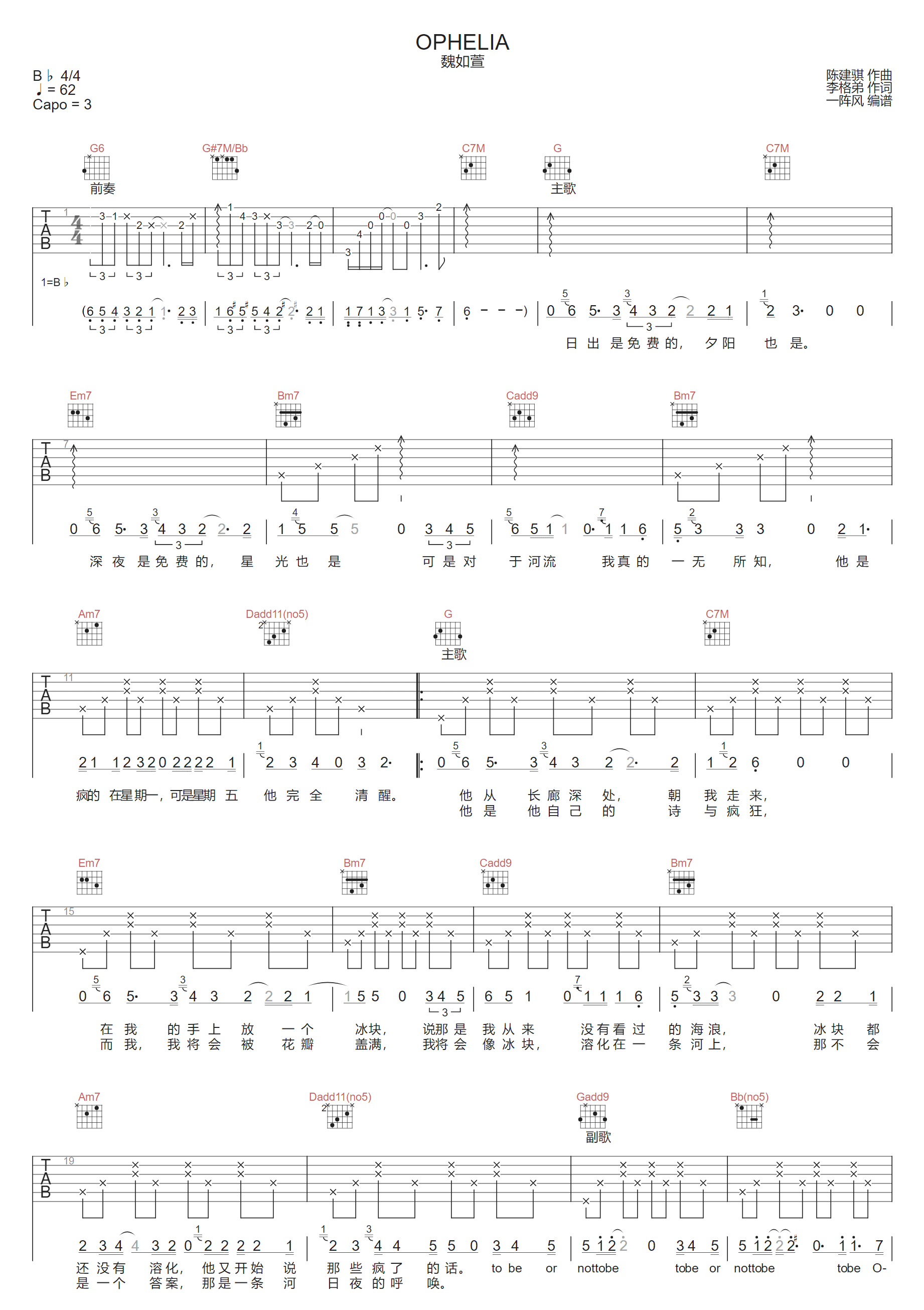 Ophelia吉他谱,歌曲原调为降B调,此版本的曲谱来源于@一阵风,为4/4拍的节奏,按G调指法编配,共2张高清吉他谱,变调夹3品为原歌曲的调式,演唱时可按个人音域选择合适的变调夹位置。