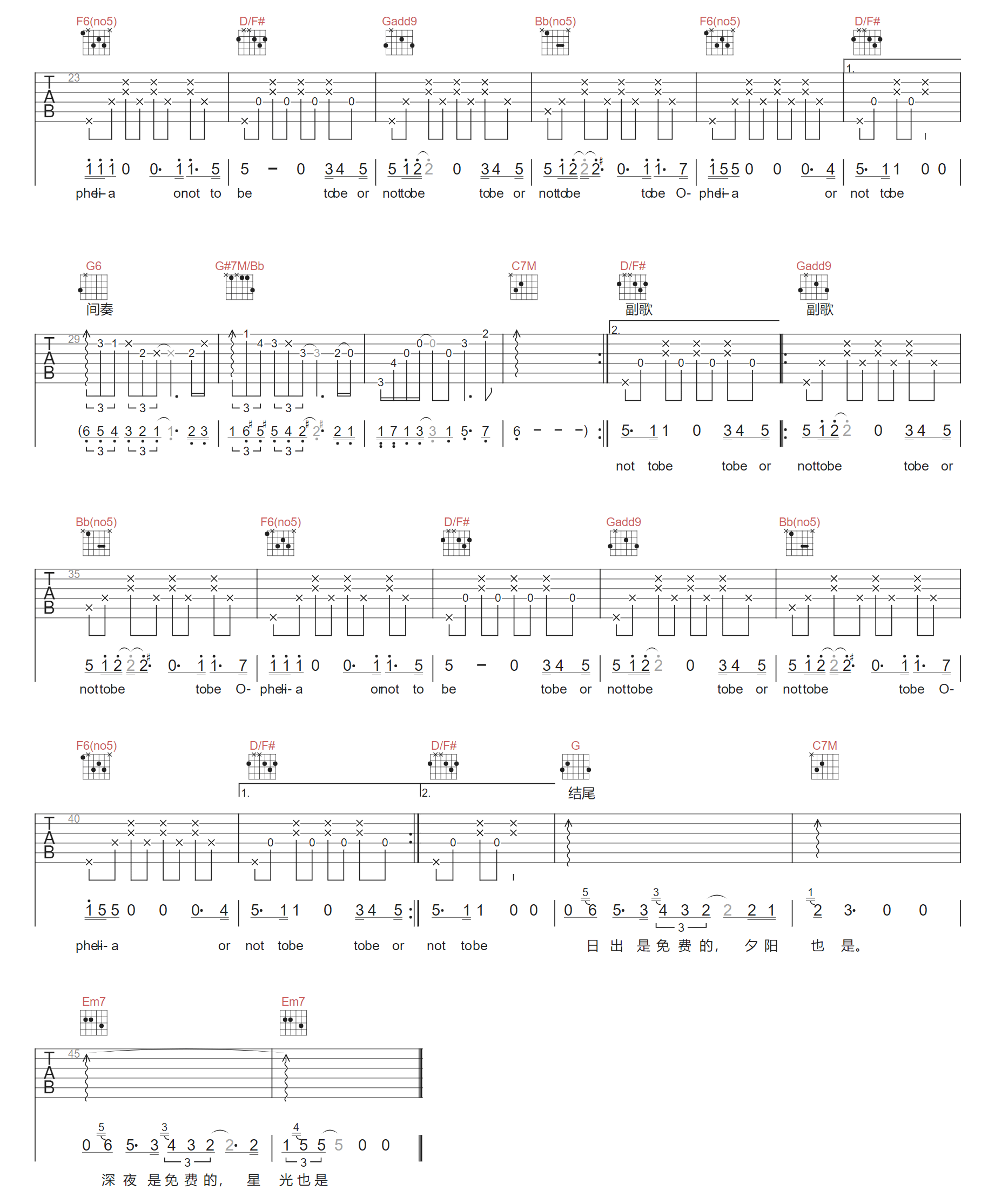 Ophelia吉他谱_魏如萱_G调原版弹唱谱_图片六线谱