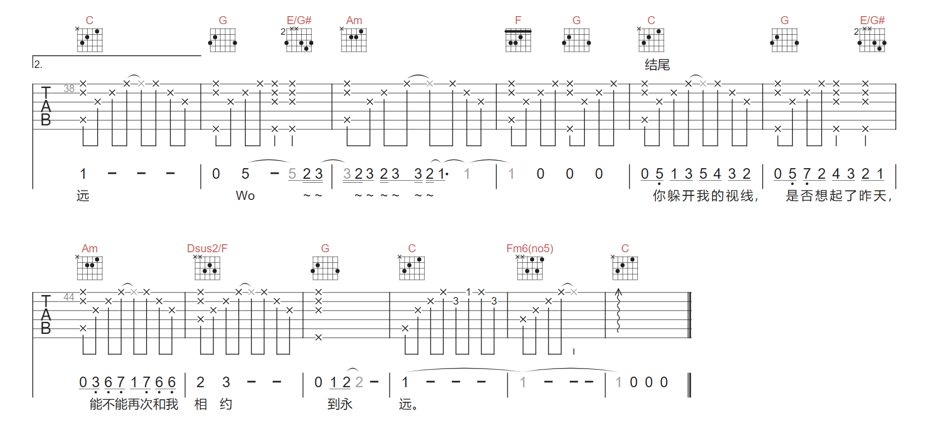 相约吉他谱,歌曲原调为C调,此版本的曲谱来源于@网络转载,为4/4拍的节奏,按C调指法编配,共2张高清吉他谱,变调夹不夹为原歌曲的调式,演唱时可按个人音域选择合适的变调夹位置。