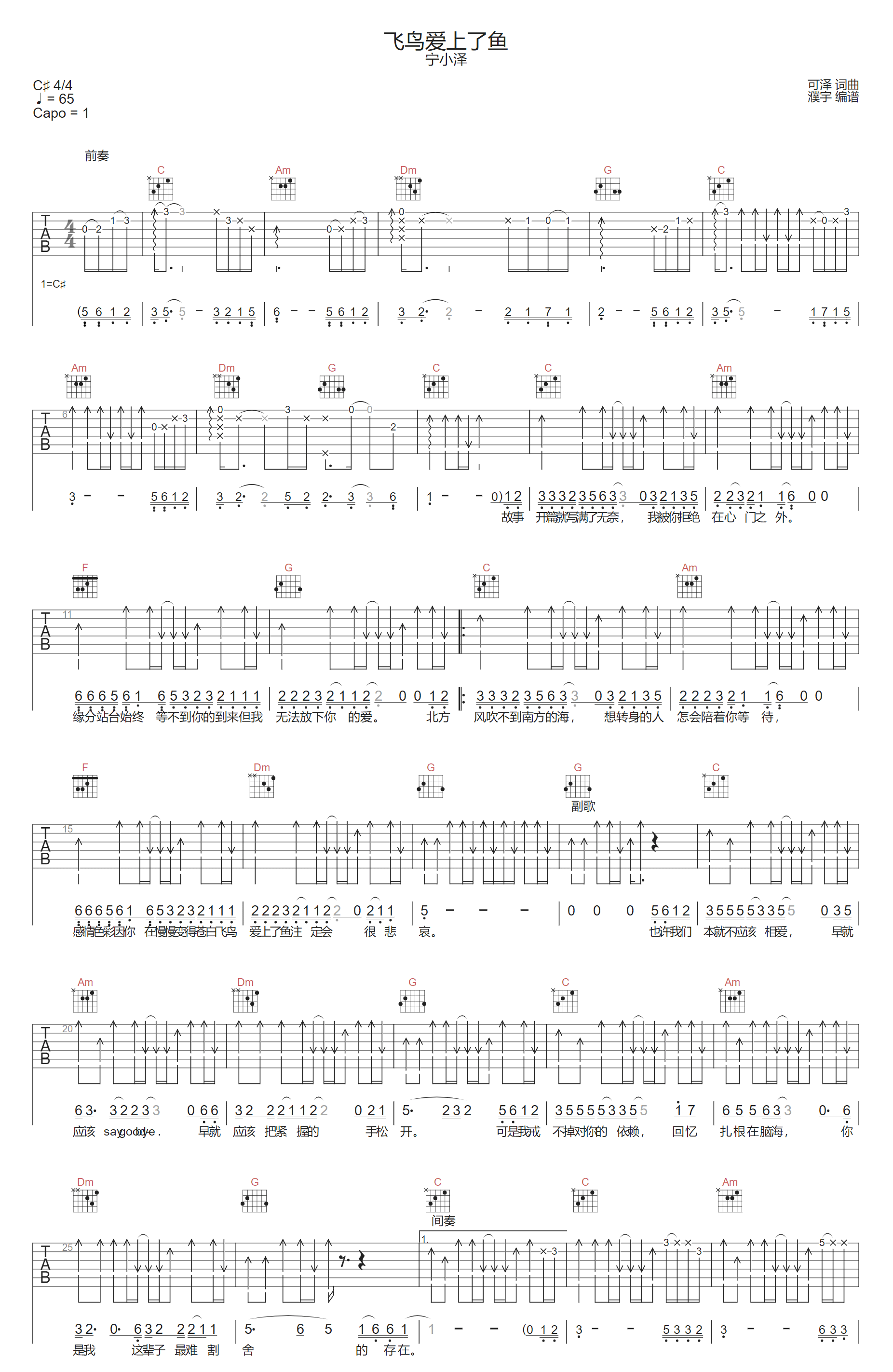 飞鸟爱上了鱼吉他谱,歌曲原调为#C调,此版本的曲谱来源于@濮宇,为4/4拍的节奏,按C调指法编配,共2张高清吉他谱,变调夹1品为原歌曲的调式,演唱时可按个人音域选择合适的变调夹位置。