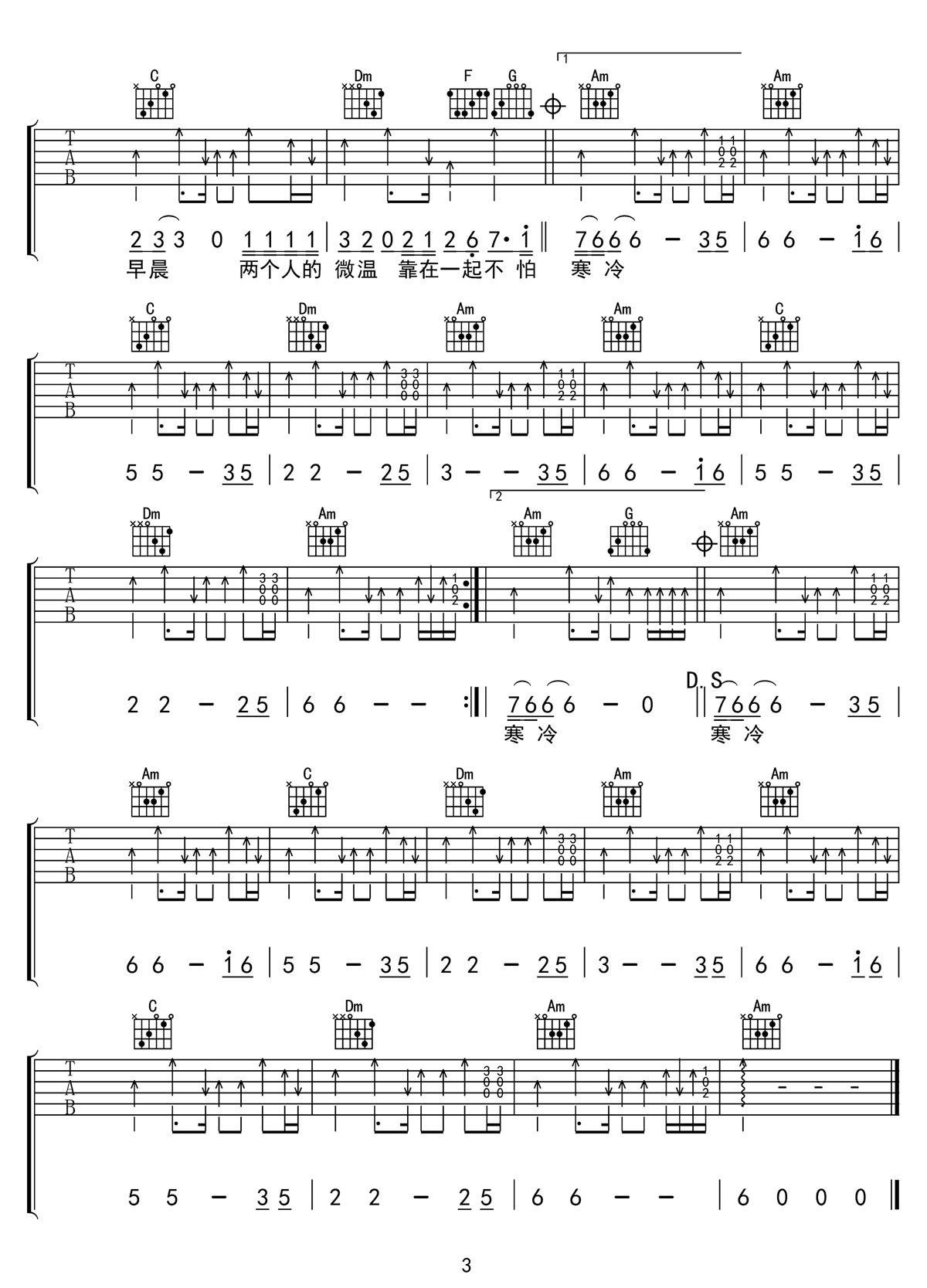 江南雪吉他谱,歌曲原调为D调,此版本的曲谱来源于@两万五,为4/4拍的节奏,按C调指法编配,共3张高清吉他谱,变调夹2品为原歌曲的调式,演唱时可按个人音域选择合适的变调夹位置。 -