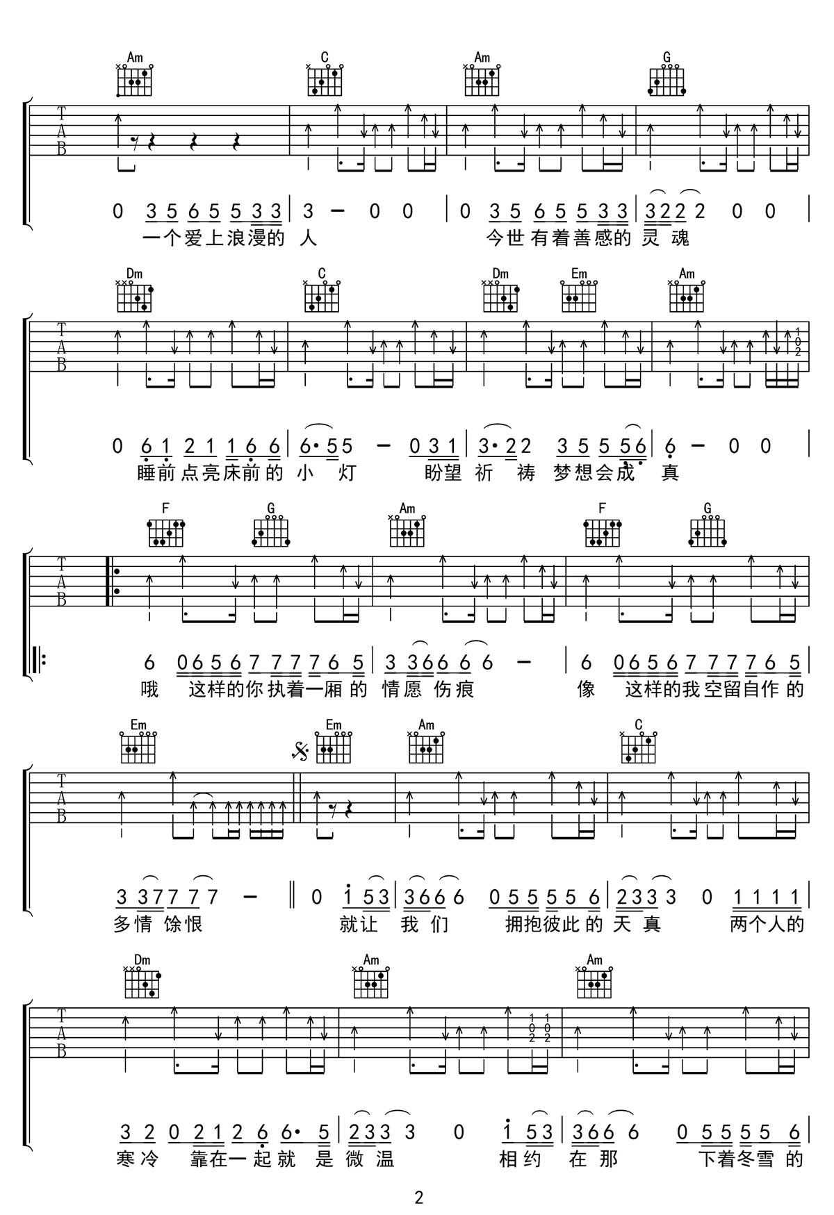 一个爱上浪漫的人吉他谱,歌曲原调为#C调,此版本的曲谱来源于@52JT,为4/4拍的节奏,按C调指法编配,共3张高清吉他谱,变调夹1品为原歌曲的调式,演唱时可按个人音域选择合适的变调夹位置。