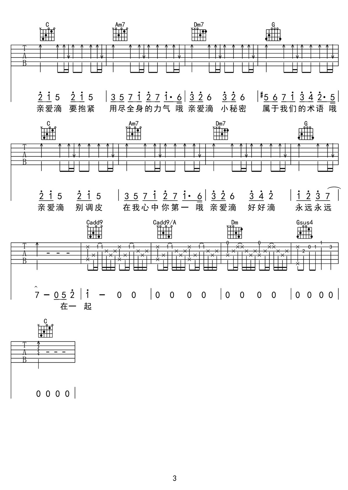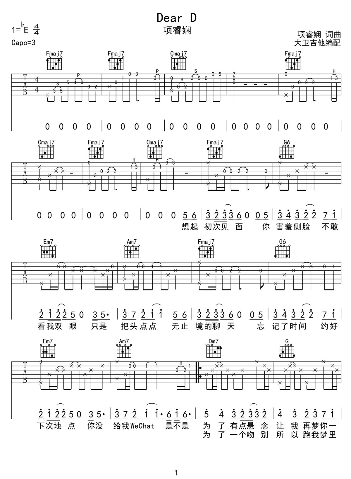 Dear-D吉他谱,歌曲原调为降E调,此版本的曲谱来源于@大卫吉他,为4/4拍的节奏,按C调指法编配,共3张高清吉他谱,变调夹3品为原歌曲的调式,演唱时可按个人音域选择合适的变调夹位置。