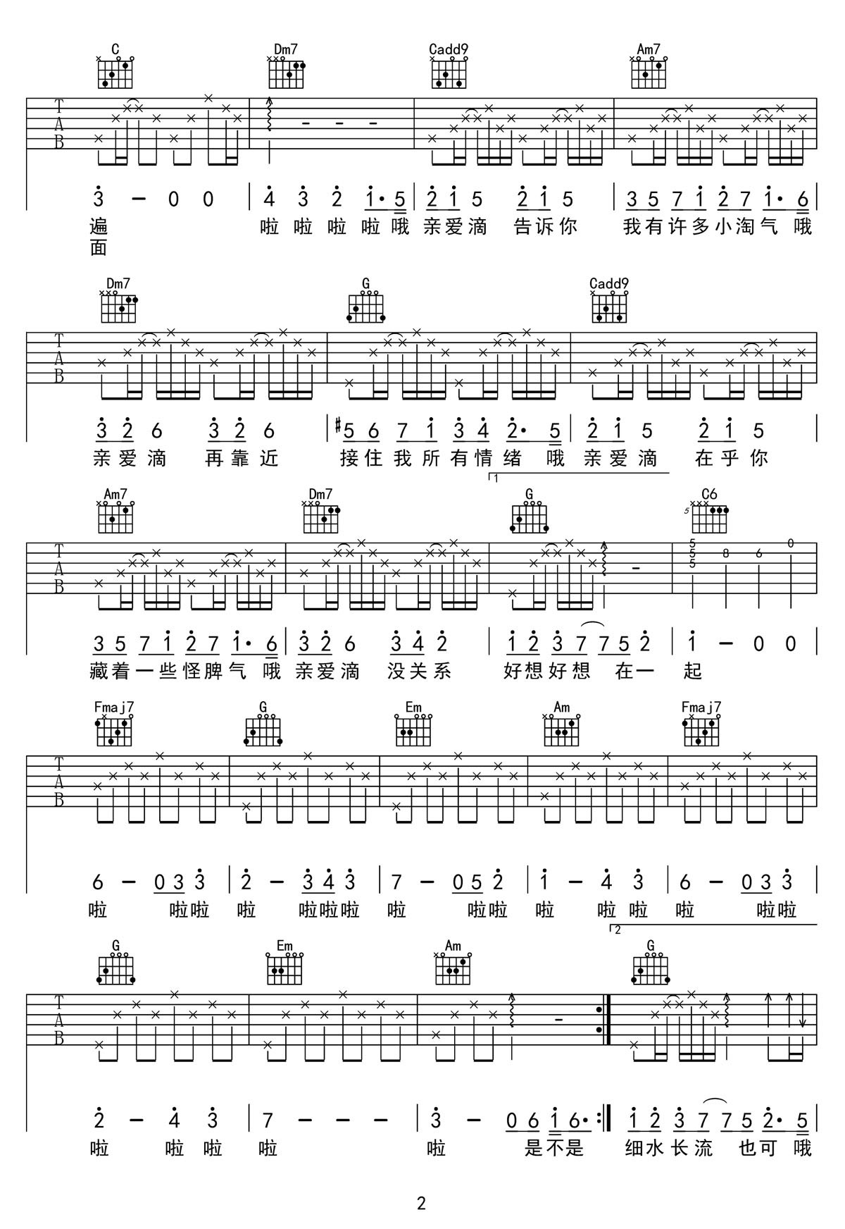 以后吉他谱,歌曲原调为A调,此版本的曲谱来源于@拉拉guitar,为4/4拍的节奏,按G调指法编配,共2张高清吉他谱,变调夹2品为原歌曲的调式,演唱时可按个人音域选择合适的变调夹位置。 -