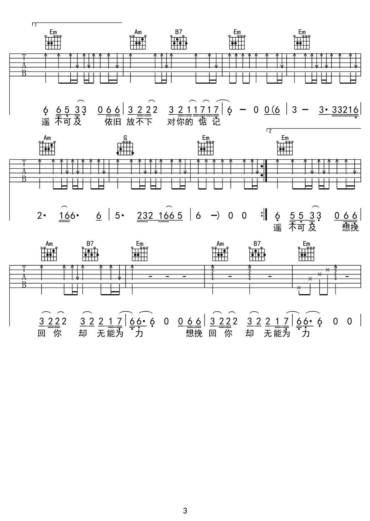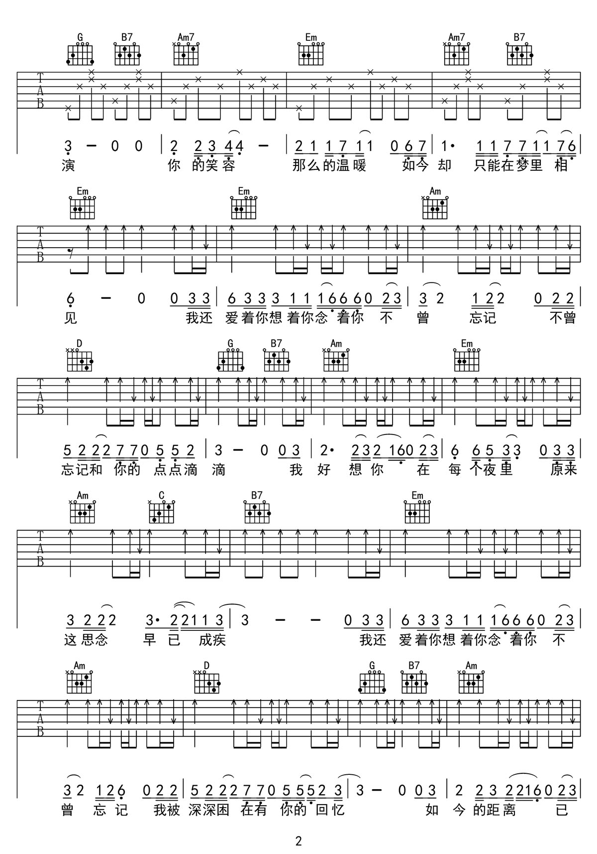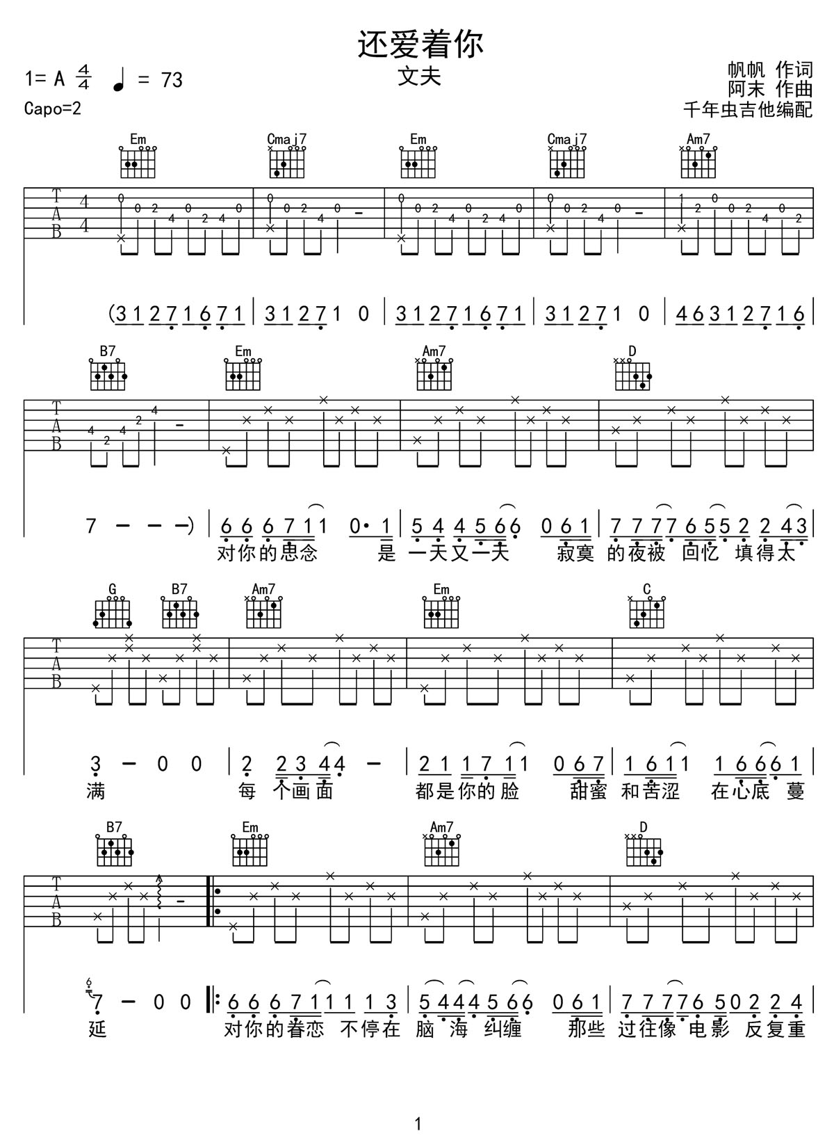 还爱着你吉他谱,歌曲原调为A调,此版本的曲谱来源于@千年虫吉他,为4/4拍的节奏,按G调指法编配,共3张高清吉他谱,变调夹2品为原歌曲的调式,演唱时可按个人音域选择合适的变调夹位置。