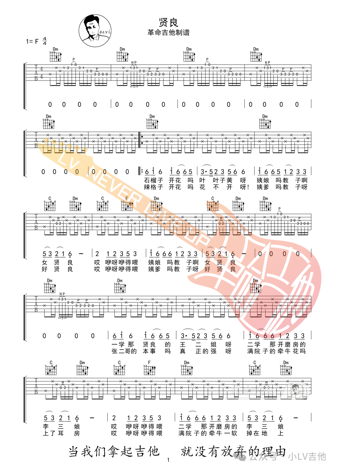贤良吉他谱,歌曲原调为F调,此版本的曲谱来源于@革命吉他,为4/4拍的节奏,按F调指法编配,共3张高清吉他谱,变调夹不夹为原歌曲的调式,演唱时可按个人音域选择合适的变调夹位置。